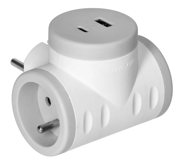 Informacje dodatkowe: Rozgałęźnik elektryczny, który po uprzednim podłączeniu do gniazda pozwala na jednoczesne podpięcie dwóch urządzeń elektrycznych oraz korzystanie z gniazda USB A oraz USB C.