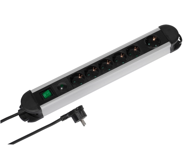 Informacje dodatkowe: aluminiowa obudowa, płaska wtyczka, jedno duże gniazdo dla większych wtyczek, specjalne zabezpieczenia styków minimalizuje ryzyko przypadkowego kontaktu, wtyki obrócone o 45 stopni, możliwość montażu na ścianie, 6 gniazd schuko