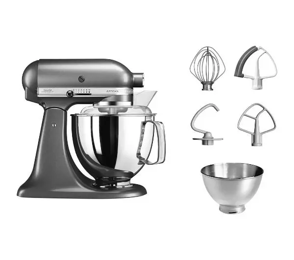 <h4>KitchenAid ARTISAN 5KSM175PS (srebrzystopopielaty)</h4><p>Ikona designu, mikser planetarny produkowany w USA od 1937 roku, dostępny w ponad 20 kolorach, wykonany z metalu, z silnikiem o dużym momencie obrotowym z bezpośrednim napędem i przekładnią planetarną, czterema narzędziami, osłoną oraz dwiema dzieżami ze stali nierdzewnej.</p><h4>Poznaj KitchenAid ARTISAN 5KSM175PS</h4><a></a><h5>ZACHWYCAJĄCY DESIGN</h5><p>Ponadczasowy design, który nie zmienił się od 1937 roku i mnogość kolorów sprawiają, że mikser KitchenAid Artisan to prawdziwa perełka na blacie kuchennym. Wysoka bezawaryjność urządzenia to zasługa solidnej konstrukcji, wykonanej w całości z metalu. Jest łatwy w czyszczeniu. Połączenie optymalnej wagi z antypoślizgowymi gumowymi nóżkami sprawia, że sprzęt podczas pracy nie przesuwa się na kuchennym blacie.</p><a></a><h5>CICHY NAPĘD</h5><p>Poszukujesz uniwersalnego urządzenia do wielu czynności kuchennych? KitchenAid ARTISAN 5KSM175PS z ekonomicznym silnikiem 300 W oferuje odpowiedni zapas momentu obrotowego do wyrabiania ciast. Dzięki bezpośredniemu napędowi sprzęt zapewnia stabilną, cichą pracę oraz perfekcyjne mieszanie i napowietrzanie mas z wykorzystaniem 67-punktowego systemu planetarnego.</p><a></a><h5>FUNKCJONALNE AKCESORIA</h5><p>KitchenAid ARTISAN 5KSM175PS to propozycja dla entuzjastów domowych wypieków i makaronów – w zestawie z urządzeniem znajdziesz dwa mieszadła do łatwego przygotowania kremów budyniowych czy ucieranych babek, hak do wyrabiania ciasta oraz specjalną rózgę pozwalającą na szybkie ubicie piany z białek czy śmietany.</p><h4>KitchenAid ARTISAN 5KSM175PS z bliska</h4><h6>1 METALOWA KONSTRUKCJA</h6><p>Wykonany z odlewu ciśnieniowego korpus oraz solidne, metalowe koła zębate oferują długie i bezproblemowe działanie urządzenia, potwierdzone 5-letnią gwarancją producenta.</p><h6>2 SYSTEM PLANETARNY</h6><p>Mieszadła miksera poruszają się jednocześnie dookoła własnej osi i dookoła misy, co zwiększa efektywność łączenia składników i napowietrzania mas.</p><h6>3 PRAKTYCZNE WYPOSAŻENIE</h6><p>Dołączone do miksera dzieże robocze o pojemności 4,8 l oraz 3 l wykonano ze stali nierdzewnej, dzięki czemu nadają się do mycia w zmywarce.</p><h4>W opakowaniu KitchenAid ARTISAN 5KSM175PS</h4><h6>1Instrukcja obsługi w języku polskim</h6><h6>2Karta gwarancyjna</h6><h6>3Narzędzie do mieszania</h6><h6>4Narzędzie do mieszania mas cukierniczych FLEX</h6><h6>5Narzędzie do ubijania (rózga)</h6><h6>6Narzędzie do wyrabiania ciasta (hak)</h6><h6>7Dzieża 4,8 l z osłoną</h6><h6>8Dzieża 3 l</h6><h6>9Mikser planetarny</h6><h6>10Osłona na dzieżę</h6><h4>KitchenAid – marka godna zaufania</h4><p>5 lat gwarancji</p><p>Ultrawytrzymałe produkty ze stylowym wzornictwem</p><p>100 lat doświadczenia w produkcji akcesoriów kuchennych</p>