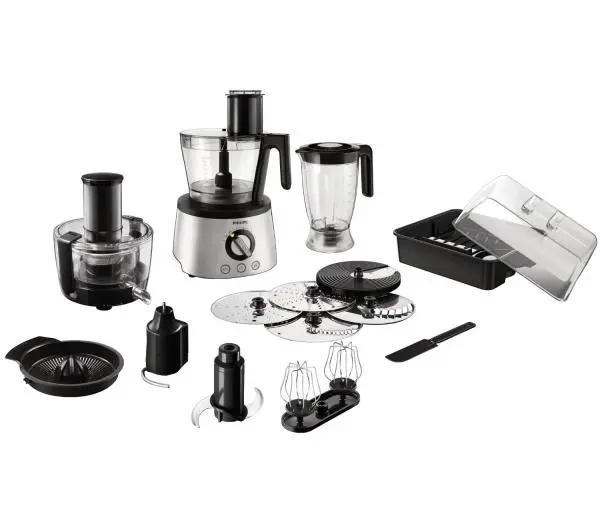 : blender, dwustronna tarcza do rozdrabniania na drobno i grubo, instrukcja obsługi w języku polskim, karta gwarancyjna, końcówka do ubijania, łopatka, narzędzie do wyrabiania ciasta, pojemnik na akcesoria, pojemnik z pokrywką, popychacz, sokowirówka, tarcza do cięcia w słupki, tarcza do frytek, tarcza do plastrów z regulacją grubości , tarcza do tarcia ziemniaków, wyciskarka do cytrusów