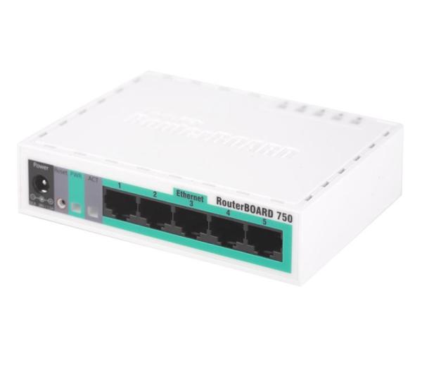 <p>Mikrotik RB750 jest routerem przeznaczonym głównie na rynek SOHO. Urządzenie oparte jest na procesorze Atheros AR7240 i wyposażone jest w 32 MB SDRAM oraz 64MB NAND. Wysoka wydajność platformy sprawia, że urządzenie poradzi sobie nawet z bardziej wymagającymi zadaniami, jak np. kształtowanie ruchu. RouterBoard 750 ma 5 portów Fast Ethernet i sprzedawany jest z preinstalowaną licencją na system RouterOS level 4.</p>