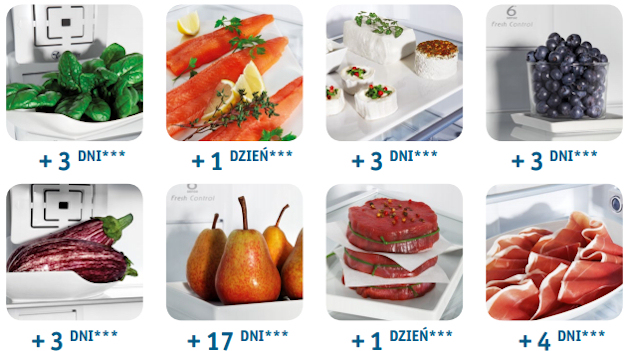 Funkcja 6-ty Zmysł Fresh Control pomaga produktom zachować świeżość, smak i kolor nawet 4 razy dłużej. Utrzymuje optymalną temperaturę i wilgotność na poziomie 70-85%, dzięki czemu po kilku dniach jedzenie jest świeże jak w dniu zakupu.