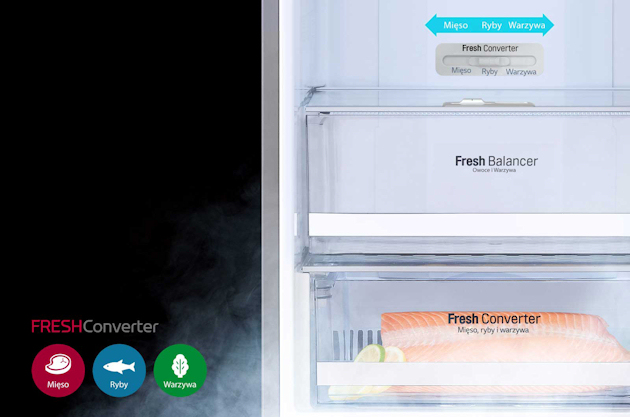 Różne produkty wymagają różnej wilgotności, aby zachowały świeżość. Szuflada Fresh Converter umożliwia regulację wilgotności i dostosowania jej do przechowywania mięsa, ryb i warzyw.