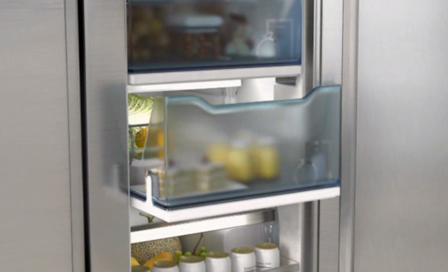 Wysuwane szuflady w drzwiach Showcase pozwalają w łatwy sposób odnaleźć potrzebne produkty. Dolne pojemniki można w całości wyjąć z szuflady i postawić np. na stole.