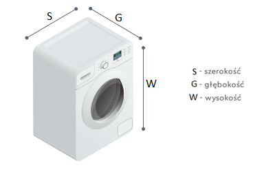 Głębokość i szerokość mierzone są wzdłuż krawędzi blatu pralki, wysokość po jej zewnętrznej krawędzi. Podane wymiary nie uwzględniają wystających elementów pralki, takich jak pokrętła, drzwiczki, wypukła obudowa, czy elementów związanych z podłączeniem pralki. Wysokość mierzona jest wraz z nóżkami urządzenia.