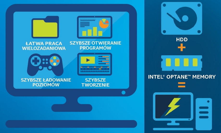 Intel® Optane™ to technologia inteligentnej pamięci, która podnosi produktywność dysku twardego typu HDD. Umożliwia szybszy dostęp do często używanych dokumentów, zdjęć, filmów i plików aplikacji. Jeśli twój komputer wyposażony jest w dysk twardy (HDD), pamięć Intel® Optane™ zapewni mu szybszy czas reakcji (odczyt i zapis danych) zbliżony do dysku SSD.