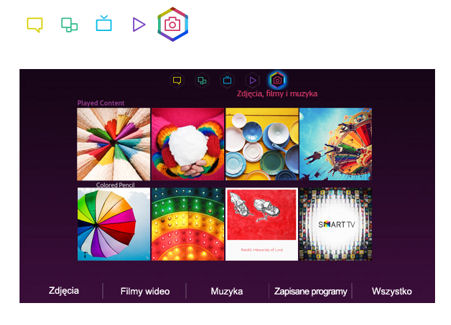 Zdjęcia, filmy i muzykaWybór w oparciu o dotychczas oglądane programy Rozwiązanie Samsung AllShare umożliwia stworzenie domowej sieci bezprzewodowej, w ramach której można udostępniać zawartość zapisaną w kompatybilnych urządzeniach, takich jak komputer czy aparat fotograficzny. Teraz możesz z łatwością przeglądać swoje zasoby, od zdjęć po muzykę, na ekranie swojego Samsung Smart TV. |