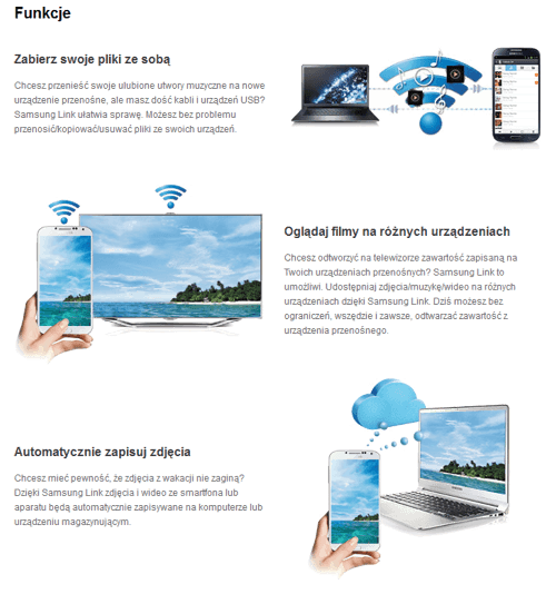 Samsung Link - (dostęp do zasobów w sieci lokalnej, dostęp przestrzeni dyskowej w chmurze) - korzystaj ze swoich materiałów w dowolnym momencie, w każdym miejscu i na każdym urządzeniu. Możesz łatwo odtwarzać treści zapisane w innym urządzeniu lub schowku albo przesyłać je pomiędzy urządzeniami. Oglądaj firmy zapisane na innym urządzeniu bez konieczności używania przewodów!