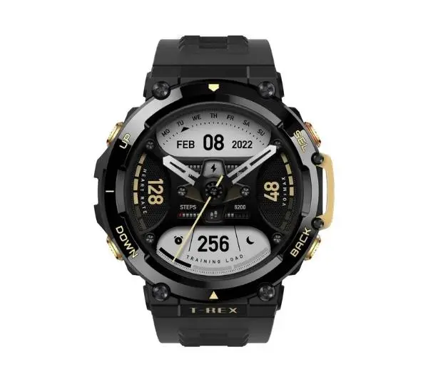 <h2>Smartwatch Amazfit T-Rex 2 (czarno-złoty)</h2>Amazfit T-Rex 2 to idealny towarzysz każdego treningu – obsługuje ponad 150 trybów sportowych, a ponieważ jest odporny na niskie temperatury i wodę, sprawdza się zarówno na nartach, jak i podczas pokonywania basenów. Smartwatch ma też pojemną baterię wytrzymującą do 24 dni bez ładowania.2-zakresowy GPS i 5 systemów satelitarnych – dokładna nawigacjaWojskowa trwałość – odporność na ultraniskie temperaturyImportowanie tras – więcej szlaków do dyspozycji 1Akumulator zapewniający nawet 24 dni pracy bez ładowaniaSzeroki wybór ćwiczeń – ponad 150 trybów sportowychRozpoznawanie rodzaju treninguIdealny do pływania – wodoodporność 10 ATM/100 mWięcej możliwości z aplikacją Zepp OS<h2>Poznaj smartwatch Amazfit T-Rex 2</h2> Wojskowa klasa trwałościSzukasz towarzysza szalonych wypraw w nieznane? Smartwatch Amazfit T-Rex 2 okaże się strzałem w dziesiątkę! Urządzenie zostało poddane aż 15 testom klasy wojskowej, dlatego możesz mieć pewność, że nie zawiedzie Cię nawet w najbardziej ekstremalnych warunkach. Zabierz go na górską wędrówkę, zimowe szlaki i w egzotyczne podróże do tropikalnych lasów. Szeroki wybór tarczWygląd prezentowanego smartwatcha zachęci Cię do kolejnych przygód – inspirowany naturą będzie Ci przypominał o przygodach, które już za Tobą i pobudzi do planowania kolejnych. Zegarek oferuje dziesiątki wyświetlaczy always-on-display i pozwala na personalizowanie tarczy. Starannie zaprojektowanyAmazfit T-Rex 2 ma przemyślaną konstrukcję pozwalającą na swobodne korzystanie ze smartwatcha w każdej sytuacji. Duży, czytelny ekran zapewnia łatwy dostęp do informacji i usprawnia wybieranie potrzebnych funkcji. Z kolei silikonowy pasek odprowadzający pot pozwala na wygodne noszenie zegarka przez cały czas – nawet w wilgotnych warunkach. Pojemny akumulatorWybierasz się na długą, samotną wędrówkę po górach i będziesz mieć ograniczony dostęp do prądu? Nie obawiaj się, że Twój smartwatch Cię zawiedzie – wyposażony w pojemny akumulator może działać bez przerwy nawet przez 24 dni przy typowym użytkowaniu. Odporność na mrózLubisz jeździć na nartach? A może chętnie zdobywasz wysokie, ośnieżone szczyty? Smartwatch Amazfit T-Rex 2 może być Twoim kompanem podczas najbardziej wymagających wypraw! Urządzenie cechuje się bowiem odpornością na zimno sięgające nawet -30°C. Precyzyjny GPSNie obawiaj się, że zboczysz z trasy i nie odnajdziesz drogi do domu – z prezentowanym zegarkiem możesz odkrywać nowe szlaki i czuć się w pełni bezpiecznie. Smartwatch ma wbudowane 2-zakresowe pozycjonowanie i obsługuje aż 5 systemów satelitarnych – poruszanie się po terenie ułatwia także kompas i wysokościomierz. Ściągaj szlaki innych osóbOdkrywanie nowych miejsc może być jeszcze ciekawsze – Amazfit T-Rex 2 oferuje opcję importowania tras z aplikacji Zepp App, więc możesz poruszać się sprawdzonymi przez inne osoby szlakami, a także śledzić swoje położenie względem wybranej ścieżki w czasie rzeczywistym. Rozpoznawanie ruchówZacznij swój codzienny trening, a urządzenie Amazfit T-Rex 2 automatycznie wykryje ćwiczenia i rozpozna ich rodzaj – dotyczy to 15 typów2 ćwiczeń siłowych. Oprócz tego, zegarek będzie zliczał powtórzenia serii oraz wykryje odpoczynek, uwzględniając go w podsumowaniu. Szablony treningoweJuż nie potrzebujesz personalnego trenera, by korzystać ze starannie opracowanych planów ćwiczeń – z urządzeniem Amazfit T-Rex 2 samodzielnie stworzysz efektywne szablony, w których podzielisz trening na 4 etapy – rozgrzewkę, trening, odpoczynek i regenerację. Mnóstwo trybów ćwiczeńKochasz sport, więc Twoje treningi są zróżnicowane i często składają się z różnych dyscyplin? W takim razie prezentowany smartwatch spełni Twoje oczekiwania. Znajdziesz w nim ponad 150 trybów sportowych, w tym zupełnie nowe – Triathlon, Track Run czy Golf Swing stworzone specjalnie dla sportowych maniaków. WodoodpornośćKochasz pływać? A może podczas wypraw pełnych przygód nieraz zdarzyło Ci się zrelaksować w strumieniu lub w strugach wodospadu? Smartwatch Amazfit T-Rex 2 może Ci towarzyszyć podczas każdej wodnej zabawy – dzięki klasie wodoodporności 10 ATM może być zanurzany nawet na głębokość 100 m! Monitorowanie zdrowiaW smartwatchu zastosowany został starannie zaprojektowany czujnik optyczny 6PD BioTracker™ 3.0 PPG, dzięki któremu możesz stale śledzić funkcje swojego organizmu. Pozwala na monitorowanie tętna, natlenienia krwi (SpO2) i poziomu stresu, a nawet kontroluje oddech. Wszystkie wymienione parametry możesz poznać za pomocą jednego dotknięcia.Zawartość opakowania Amazfit T-Rex 2W opakowaniu Smartwatch Stacja ładująca Instrukcja użytkowaniaAmazfit – marka godna zaufaniaChińska marka o globalnym zasięguNa rynku od 2015 rokuUrządzenia dla aktywnych fizycznieInnowacyjne smartwatche o wysokiej wytrzymałości Zaufanie konsumentów Inteligentne rozwiązania w smartwatchachInformacje dodatkowe 1. Możliwość importu tras w formacie gpx nastąpi po aktualizacji OTA 22. Rozpoznawanie kolejnych ćwiczeń siłowych nastąpi po aktualizacji OTA 2.