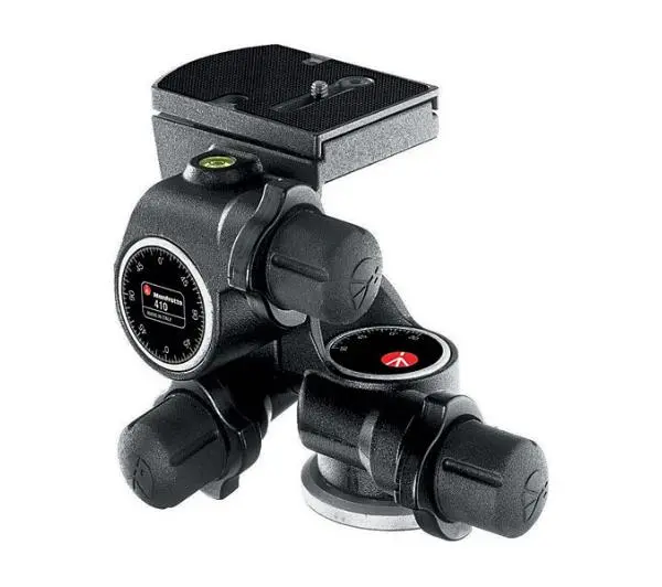 Unikalna głowica o bardzo zwartej budowie. Umożliwia ustawienia pozycji aparatu poprzez przekładnie zębate w trzech płaszczyznach (poziomej, pionowej oraz na boki). Ruch w każdej osi obsługiwany jest przez dwa pokrętła – większe służy do wysprzęglenia połączenia zębatego i szybkie ustawienie pozycji, natomiast mniejsze pokrętło pozwala na niezwykle precyzyjną regulację. Głowica jest wyposażona w płytkę 410PL do szybkiego odłączania aparatu. Idealna do fotografii produktów i architektury. Mocowanie aparatu: gwint 1/4″ z dodatkową śrubą 3/4″