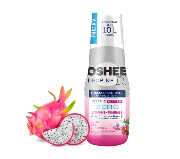<h2>Hydrokoncentrat Oshee Drop In Zero Witaminy i minerały o smaku czerwonych winogron - dragonfruit - 500 ml</h2><p>Hydrokoncentrat napoju witaminowego Oshee Drop In Zero, wzbogacony o witaminy i minerały bez cukru, wyróżniający się smakiem czerwonych winogron i smoczego owocu (dragonfruit). Idealny do samodzielnego przygotowania napoju. Prosty w dozowaniu.</p><p>Hydrokoncentrat napoju witaminowego bez dodatku cukru – smak czerwonych winogron i smoczego owocu. Wydajna butelka 500 ml pozwala na przygotowanie aż do 10 litrów pysznego napoju Oshee Drop In (40 szklanek), wzbogaconego o witaminę B12, cynk i jod.</p><h3>Dlaczego warto pić hydrokoncentrat Oshee Drop In:</h3><ul> <li>Skuteczne nawodnienie</li> <li>Uzupełnienie witamin i cennych składników odżywczych</li> <li>Wsparcie w walce ze zmęczeniem i znużeniem</li> <li>Bez cukru i zbędnych kalorii</li> <li>Orzeźwiający smak czerwonych winogron i dragonfruit</li></ul><h3>Zrób sobie napój z witaminami i minerałami</h3><p>Cynk: pozytywnie wpływa na kondycję włosów, skóry i paznokci, wspomaga ochronę komórek przed stresem antyoksydacyjnym.</p><p>Jod: pomaga w prawidłowej pracy tarczycy i hormonów tarczycy, przyczynia się ponadto do utrzymania prawidłowego metabolizmu energetycznego.</p><p>Witamina B12: ma wpływ na funkcje psychologiczne i działanie układu nerwowego. Dobrze sprawdza się też wówczas, gdy musisz walczyć ze zmęczeniem i znużeniem w pracy, szkole lub w innym miejscu.</p><h3>Proste i wygodne stosowanie Oshee Drop In – Witaminy i Minerały</h3><p>Użycie hydrokoncentratu jest banalnie proste! Wbudowana miarka w butelce pozwala precyzyjnie odmierzyć potrzebną ilość koncentratu – linie na miarce wskazują, ile napoju uzyskasz po rozcieńczeniu.</p><p>Wystarczy odmierzyć wybraną porcję, przelać do szklanki, bidonu lub butelki termicznej, a następnie uzupełnić wodą – gazowaną lub niegazowaną. Z jednej butelki przygotujesz aż 40 porcji witaminowego napoju Oshee Drop In!</p><h3>Oshee Hydrokoncentrat – funkcjonalne nawodnienie i wyjątkowy smak</h3><p>Ten napój witaminowy to nie tylko solidna dawka składników odżywczych, ale też prawdziwa przyjemność dla podniebienia. Połączenie czerwonych winogron i smoczego owocu (Oshee Dragonfruit) zapewnia orzeźwiający, nietuzinkowy smak.</p><p>Bez dodatku cukru, sztucznych aromatów, barwników i syropu glukozowo-fruktozowego – tylko to, co potrzebne, bez zbędnych kalorii. Idealny wybór dla tych, którzy cenią zdrowe i smaczne nawodnienie każdego dnia.</p><h3>Składniki</h3><p>woda, regulator kwasowości (kwas cytrynowy), zagęszczony sok z czarnej marchwi, naturalny aromat winogronowy z innymi naturalnymi aromatami, naturalny aromat, substancja słodząca (sukraloza), substancje konserwujące (sorbinian potasu, benzoesan sodu), stabilizator (sól sodowa karboksymetylocelulozy), przeciwutleniacz (kwas askorbinowy), niacyna, mleczan cynku, kwas pantotenowy, witamina B6, kwas foliowy, jodek potasu, biotyna, witamina B12.</p><h3>Wartość odżywcza w 100 ml napoju*</h3><p>Wartości odżywcze gotowego napoju przygotowanego zgodnie z instrukcją:</p><p>Wartość energetyczna: 2 kJ / 0 kcal, Tłuszcz: 0 g, w tym kwasy tłuszczowe nasycone: 0 g, Węglowodany: 0 g, w tym cukry: 0 g, Białko: 0 g, Sól: 0 g, Niacyna: 1,76 mg (11%**), Kwas pantotenowy: 0,66 mg (11%**), Witamina B6: 0,15 mg (11%**), Biotyna: 5,50 μg (11%**), Kwas foliowy: 22,0 µg (11%**), Witamina B12: 0,28 µg (11%**), Cynk: 1,11 mg (11%**), Jod: 16,5 µg (11%**)</p><p>*gotowego napoju przygotowanego zgodnie z instrukcją**% dziennej referencyjnej wartości spożycia dla osoby dorosłej</p>