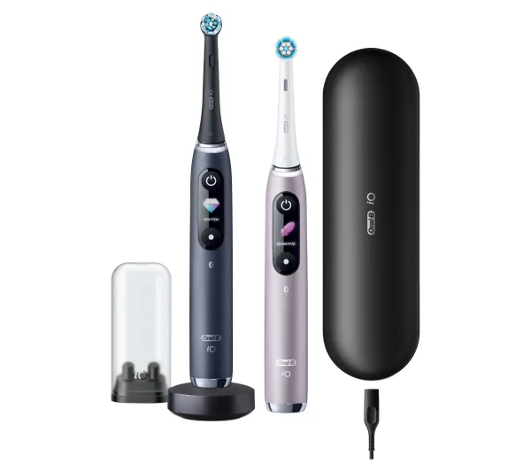 <h2>Oral-B iO Series 9 Duo Black&Rose</h2>Z zestawem Oral-B iO Series 9 Duo łatwiej i dokładniej zadbasz o zdrowy uśmiech. Elektryczna szczoteczka serii 9. gwarantuje precyzyjne mycie zębów, a dzięki kontroli nacisku pozwala jednocześnie chronić delikatne dziąsła przed podrażnieniami.Magnetyczna technologia szczotkowania iOKontrola nacisku dla ochrony dziąsełOkrągła szczoteczka z mikrowibracjamiMonitorowanie zębów 3D – dla dokładniejszego myciaPraktyczne informacje na wyświetlaczu interaktywnym<h2>Poznaj szczoteczkę elektryczną Oral-B iO Series 9</h2> Magnetyczna technologia szczotkowaniaSzczoteczka elektryczna Oral-B iO Series 9 podczas pracy wykorzystuje innowacyjną technologię magnetyczną iO, która zapewnia jeszcze lepsze efekty szczotkowania niż dotychczas. Możesz się cieszyć uczuciem doskonale czystych zębów, a jednocześnie mieć pewność, że zęby są myte z najwyższą delikatnością. Czujnik siły nacisku szczoteczkiMasz delikatne dziąsła i musisz zadbać o subtelne szczotkowanie zębów? Prezentowana szczoteczka Ci w tym pomoże – zastosowany w niej został specjalny czujnik wykrywający siłę, z jaką główka szczoteczki jest przyciskana podczas szczotkowania. Sygnalizuje to 3 kolorami: czerwonym przy nadmiernej, białym przy niedostatecznej i zielonym przy odpowiedniej sile nacisku. Różne tryby czyszczenia zębówZ urządzeniem Oral-B iO Series 9 dopasujesz pracę szczoteczki do indywidualnych potrzeb. Pracuje ona w kilku różnych trybach: czyszczenia codziennego, delikatnego, superdelikatnego, dokładnego, pielęgnacji dziąseł czy wybielania. Dzięki temu za każdym razem możesz łatwo osiągnąć pożądany efekt. Funkcjonalny wyświetlaczNa obudowie szczoteczki umieszczony został mały, ale w pełni czytelny wyświetlacz. Pokazywane są na nim rozmaite informacje – m.in. używany aktualnie tryb szczotkowania, przypomnienia o wymianie końcówki oraz uśmiechnięta buźka sygnalizująca, że zęby zostały umyte prawidłowo. Baza ładującaWraz ze szczoteczką elektryczną Oral-B iO Series 9 otrzymasz magnetyczną stację ładującą, która pozwala na błyskawiczne zasilenie urządzenia – w zaledwie 3 godziny! Szczoteczka zdąży się zatem naładować pomiędzy kolejnym szczotkowaniem zębów. Aplikacja na telefonPrezentowana szczoteczka może za pośrednictwem technologii Bluetooth połączyć się z aplikacją Oral-B w Twoim telefonie. Dzięki niej będziesz śledzić, czy zęby szczotkowane są dokładnie oraz wyrobisz sobie lepsze nawyki w zakresie higieny jamy ustnej – wszystko dla pięknego i zdrowego uśmiechu. Kontrola precyzji szczotkowaniaFunkcja monitorowania zębów 3D sprawia, że podczas szczotkowania z użyciem urządzenia Oral-B iO Series 9, Twoje ruchy są przez cały czas śledzone. Pomaga to w ocenie, czy wszystkie obszary zębów zostały równomiernie wymyte. Funkcjonalne etuiDo produktu dołączone zostało także niezbędne w podróży etui Power2Go. Dzięki niemu szczoteczka jest skutecznie chroniona przed uszkodzeniami na skutek wstrząsów i uderzeń, a także jednocześnie jest zasilana – etui pełni funkcję powerbanku. Cicha praca urządzeniaOral-B iO Series 9 zapewnia ciche, dyskretne szczotkowanie. W związku z tym podczas codziennych zabiegów higienicznych możesz np. oglądać filmiki w telefonie bez obaw, że przez hałasującą szczoteczkę ominą Cię zabawne dialogi. System mikrowibracjiDla zdrowszych dziąseł i efektywnego usuwania płytki nazębnej w szczoteczce elektrycznej Oral-B iO Series 9 zastosowano okrągły kształt główki oraz system mikrowibracji, który skutecznie radzi sobie z resztkami jedzenia, bakteriami i innymi zabrudzeniami typowymi dla jamy ustnej. Zastosowanie takiego połączenia sprawia, że szczotkowanie jest delikatne, a zarazem bardzo dokładne. Śledź poziom naładowania bateriiNie pozwól, by rozładowana bateria przeszkodziła Ci w codziennej pielęgnacji zębów – śledź pasek naładowania akumulatora i podłącz szczoteczkę Oral-B iO Series 9 do zasilania, gdy zacznie zbliżać się do zera. Podczas ładowania możesz śledzić postęp na wyświetlaczu, jego wygaszenie zasygnalizuje natomiast zakończenie uzupełniania energii w urządzeniu. Odmierzanie czasu szczotkowaniaPrawidłowe szczotkowanie powinno trwać ok. 2 minut – teraz każde mycie zębów zajmie Ci dokładnie tyle. W urządzeniu zastosowano timer, który pomoże odmierzyć czas co do sekundy. Ponadto co 30 sekund pulsuje aby, poinformować o konieczności szczotkowanego obszaru.<h2>Zawartość opakowania Oral-B iO Series 9</h2>W opakowaniu 2 szczoteczki elektryczne 2 końcówki Etui podróżne Ładowarka Instrukcja obsługi w języku polskimBraun – marka godna zaufaniaGlobalna markaUznanie i zaufanie konsumentów na całym świecieWysoka klasa produktówJakość potwierdzona certyfikatami oraz licznymi nagrodamiWiele lat doświadczenia Marka założona w 1921 roku