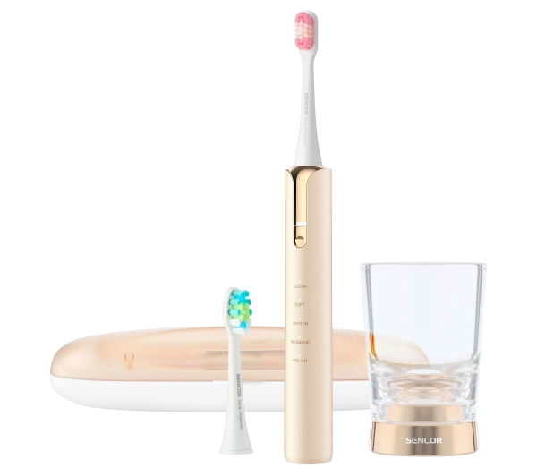 SOC 4111GDSzczoteczka soniczna Ładowarka indukcyjna w szklance plus etui podróżne z funkcją sterylizacji UV końcówek 5 zaprogramowanych trybów czyszczenia Prędkość do 40 000 na minutęDo 45 dni codziennego szczotkowania na jednym ładowaniuZ inteligentną soniczną szczoteczką do zębów Sencor SOC 4111GD na twojej twarzy zagości piękny, śnieżnobiały uśmiech. Urządzenie oferuje aż 5 zaprogramowanych trybów czyszczenia i czytelny wskaźnik LED (Light Emitting Diode) stanu akumulatora. To intuicyjna obsługa i doskonała higiena.Stopień wodoodporności zgodny z normą IPX7 ułatwia korzystanie z tego urządzenia w łazience. Szczoteczka nowej generacji z indukcyjnym ładowaniemTa zaawansowana szczoteczka soniczna oferuje aż 5 programów czyszczących i regeneracyjnych, które pozwalają dostosować pielęgnację jamy ustnej do indywidualnych potrzeb. Innowacyjne ładowanie indukcyjne poprzez szklankę sprawia, że codzienne użytkowanie staje się wygodne i stylowe. Skuteczność i troska o dziąsłaZ prędkością do 40 000 ruchów na minutę szczoteczka usuwa płytkę nazębną znacznie efektywniej niż tradycyjne modele. Specjalne ustawienie oscylacji chroni dziąsła, a technologia Quadpacer z inteligentnym timerem dzieli szczotkowanie na 4 strefy, gwarantując kompleksową higienę. Długie działanie i praktyczna konstrukcjaBateria wytrzymuje nawet 45 dni przy codziennym używaniu, a niski pobór mocy zapewnia energooszczędność. Ergonomiczna rękojeść gwarantuje wygodny chwyt, a wskaźnik LED informuje o poziomie naładowania. Dzięki klasie wodoszczelności IPX7 szczoteczka jest odporna na zanurzenie. Zestaw podróżny z nowoczesnymi akcesoriamiW komplecie znajduje się ładowarka indukcyjna, szklanka do ładowania, 2 końcówki oraz eleganckie etui podróżne z portem USB (Universal Serial Bus) i sterylizatorem UV. Etui mieści korpus i dwie końcówki lub końcówkę i pastę, a uniwersalne zasilanie 100–240 V umożliwia użycie na całym świecie. Nowoczesna i wydajna Wyjątkowy i nowoczesny design Dobrze wyważona konstrukcja Łatwa wymiana końcówek Wbudowany timer ułatwia szczotkowanie zębów przed odpowiedni, zalecany przez dentystów czas Odpowiednio wyprofilowana rączkaDane techniczne: Liczba funkcji: 5 Timer: Tak Wydajność akumulatora: do 45 dni przy codziennym użytkowaniu Ładowanie: poprzez USB‑C Prędkość ścierania: 40 000 Spełnia normę IPX7 Zawartość opakowania Szczoteczka2 głowice czyszcząceŁadowarka indukcyjnaSzklankaEtui podróżne ze złączem USB i sterylizatorem UVInstrukcja w języku polskim Porównaj inne modele <table> <tbody> <tr> <td> </td> <td></td> <td></td> <td></td> </tr> <tr> <td> </td> <td>SOC 4111GD</td> <td>SOC 4012BL</td> <td>SOC 5011GD</td> </tr> <tr> <td>Timer</td> <td></td> <td></td> <td></td> </tr> <tr> <td>Gotowe programy</td> <td>5 </td> <td>2 </td> <td>2 </td> </tr> <tr> <td>Żywotność baterii</td> <td>45 dni</td> <td>14 dni</td> <td>30 dni</td> </tr> <tr> <td>Końcówki czyszczące</td> <td>2 </td> <td>1 </td> <td>2 </td> </tr> <tr> <td>Ilość ruchów na minutę</td> <td>do 40 000 </td> <td>do 31 000 </td> <td>do 38 000 </td> </tr> <tr> <td>Zasilanie</td> <td>Akumulator</td> <td>Akumulator</td> <td>Akumulator</td> </tr> </tbody></table> Najczęściej zadawane pytania Jak często należy wymieniać końcówkę szczoteczki? Końcówkę zaleca się wymieniać co około 3 miesiące, lub wcześniej, jeśli włókna są widocznie zużyte. Regularna wymiana pomaga utrzymać wysoką skuteczność czyszczenia i chroni dziąsła. Jakie tryby czyszczenia oferują szczoteczki soniczne Sencor? Szczoteczki oferują różne tryby pracy, które można dopasować do indywidualnych potrzeb ‑ od intensywnego czyszczenia, przez delikatne mycie wrażliwych dziąseł, aż po masaż i wybielanie. Każdy tryb różni się intensywnością i częstotliwością drgań. Czy szczoteczki są wodoodporne? Tak, wszystkie modele są wodoszczelne w standardzie IPX7. Oznacza to, że można ich bezpiecznie używać pod prysznicem lub czyścić pod bieżącą wodą, bez ryzyka uszkodzenia. Jak długo działa bateria po naładowaniu? Czas pracy zależy od modelu i intensywności użytkowania ‑ może wynosić od kilkunastu do nawet 45 dni. Dzięki temu szczoteczka sprawdzi się zarówno w domu, jak i w podróży.. Jak wygląda ładowanie i czy szczoteczkę można zabrać w podróż? Szczoteczki są wyposażone w praktyczne systemy ładowania ‑ od nowoczesnych rozwiązań indukcyjnych, po uniwersalne ładowanie przez USB‑C. W zestawie często znajduje się etui podróżne, co czyni je idealnym wyborem także na wyjazdy. O firmieSencor to marka wywodząca się z Japonii, z ponad 60‑letnim doświadczeniem w produkcji sprzętów małego AGD, które znacząco poprawiają komfort i jakość życia. Wierzymy, że małe AGD to urządzenia, które dostarczają mieszkańcom nowych możliwości i wspierają ich styl życia. Projektując każdy sprzęt kierujemy się polityką 3 głównych korzyści dla klienta: niezawodność (solidne komponenty, dobre wykonanie), wielość zastosowań i możliwości (przemyślane, wygodne funkcje), wygląd (design, przywiązanie do detali).