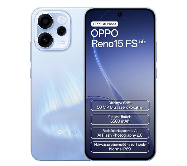 <h2>OPPO Reno15 FS 5G</h2><p>Estetyczny design inspirowany zorzą polarną</p><p>Idealny wybór do świetnych portretów</p><p>Płynne doświadczenie inspirowane iOS</p><p>Najbardziej płynna rozgrywka w wysokim FPS (frames per second) w MLBB (Mobile Legends: Bang Bang)</p><h2>DesignEstetyka zorzy polarnej</h2><p>Ten projekt powstał z inspiracji światłem i początkiem świata. Oddaje energię i odwagę miejsca, gdzie życie łączy się z marzeniami, a każdy blask oznacza start nowej drogi.</p><h3>Design Tańczącej Zorzy</h3><h3>Jeden ruch.Tętniące życie.</h3><p>Przy każdym subtelnym obrocie światło ożywa, a powierzchnia pulsuje rytmem i odnową. Miliony precyzyjnie wytrawionych tekstur OPPO Glow zmieniają fakturę zorzy w żywy, oddychający spektakl kolorów w ruchu. Piękno kosmosu zamknięte w Twojej dłoni.</p><h3>Dynamiczny Pierścień Gwiezdny</h3><h2>Pionierski w branży design „Dynamic Stellar Ring”.</h2><p>Kwadratowa aureola gwiezdnego światła otacza moduł aparatu, mieniąc się wraz z ruchem światła. W jej wnętrzu migoczą niezliczone gwiazdy, nadając każdemu zdjęciu energię, witalność i emocje.</p><h2>Warianty kolorystyczne</h2><h3>Niebieski</h3><p>Żywy fragment zorzy polarnej, mieniący się energią i zachwytem. Fale niebiańskich barw poruszają się niczym oddech.</p><h3>Granatowy</h3><p>Głęboki, refleksyjny odcień, w którym noc spotyka się z ostatnim szeptem błękitu. Potężny, nieskończony, wypełniony cichą energią niewidocznych jeszcze gwiazd.</p><h2>Wykonanie i faktura – panel Velvet Glass</h2><p>Perfekcja dotyku. Innowacyjne doświadczenie. Dostępny w wersji niebieskiej. Satynowa faktura łączy jedwabistą miękkość z odpornością na zarysowania i zabrudzenia.</p><h3>Odporność IP69 na wodę i kurz</h3><h3>Trwałość bez kompromisów.Niezwykłe ujęcia pod wodą.</h3><p>Zaprojektowany do ekstremalnych warunków — odporny na kurz, zachlapania i pełne zanurzenie. Gotowy na deszcz, zachwycający pod wodą.</p><h3>120 Hz inteligentny ekran adaptacyjny</h3><h2>Czysty ruch. Doskonała ostrość.</h2><p>6,57-calowy wyświetlacz OLED (Organic Light-Emitting Diode) z adaptacyjnym odświeżaniem 120 Hz, HDR10+ (High Dynamic Range) i rozdzielczością FHD+ (ok. 2400 × 1080 pikseli). Obsługa Splash Touch i Glove Touch zapewnia płynną reakcję w każdych warunkach.</p><p>92,8%</p><p>Proporcje ekranu do obudowy</p><p>1,07 mld</p><p>Kolory</p><p>FHD+</p><p>Rozdzielczość</p><h2>Aparat AI (Artificial Intelligence)</h2><h3>Twój najlepszy przyjaciel do portretów</h3><h3>System aparatów Ultra-Clear</h3><p>1</p><p>50 MP</p><p>Aparat główny</p><p>2</p><p>50 MP</p><p>Obiektyw makro</p><p>3</p><p>Obiektyw</p><p>ultraszerokokątny</p><p>4</p><p>50 MP</p><p>Ultraszerokokątny aparat do selfie (100°)</p><h3>50 MP ultraszerokokątny aparat do selfie</h3><h3>Więcej niż selfie— cała scena</h3><p>O 90% szersze pole widzenia pozwala uchwycić więcej świata w każdym kadrze.</p><h3>Lepsze zdjęcia razem</h3><p>Każda twarz ostra, pełna detali i życia — cała historia w jednym ujęciu.</p><h3>Styl z szerszej perspektywy</h3><p>Obiektyw 0,6× zamienia zwykłe zdjęcia w dynamiczne, efektowne kadry.</p><p>* Zdjęcia zaprezentowane poniżej wykonano serią Reno15.</p><h3>AI Flash Photography 2.0</h3><h3>Blask, który rozświetla noc</h3><p>Mocna lampa błyskowa i precyzja AI wydobywają naturalne kolory i detale po zmroku.</p><h3>AI Portrait Glow</h3><h3>Radość w każdym świetle</h3><p>Piękne portrety w każdym świetle Automatyczna analiza i idealne doświetlenie każdego ujęcia.</p><p>Lampa błyskowa</p><p>Światło naturalne</p><p>Światło konturowe</p><p>Światło studyjne</p><h3>Popout</h3><h3>Treści, które dosłownie wychodzą z kadru</h3><p>Łącz wiele zdjęć w jedną kompozycję, w której obiekty przekraczają granice obrazu.</p><h3>AI Motion Photo Slow-Mo</h3><h3>Zwolnij.Nadaj epicki charakter.</h3><p>Codzienne ruchy zamieniają się w kinowe sceny slow motion.</p><h3>AI Motion Photo Eraser</h3><h3>Usuń to, co zbędne.Zachowaj historię.</h3><p>Usuwanie przechodniów i niechcianych obiektów także ze zdjęć ruchomych.</p><h3>Wideo 4K (ok. 3840 × 2160 pikseli) Ultra-Clear</h3><p>Nagrywaj każdy moment w krystalicznej jakości 4K.</p><h2>ColorOS 16</h2><h3>Płynność i inteligencja</h3><h3>Ultra Smooth</h3><p>Płynność, która trwa nawet 5 lat.</p><h3>Nowy Trinity Engine</h3><h3>Stworzony do dużych obciążeń. Dostarczany z lekkością.</h3><p>Silnik AI dostosowujący wydajność do Twoich nawyków — idealny do gier i multitaskingu.</p><h3>O+ Connect</h3><h3>Płynne udostępnianie bez granic</h3><p>Jedno dotknięcie wystarczy, by przesyłać zdjęcia i filmy.</p><h3>AI Mind Space</h3><h2>Twój drugi mózg</h2><h3>Zapamiętuj wszystko</h3><p>Przesuń trzema palcami w górę, aby zapisać wszystko, co widzisz. Od przewodników turystycznych i materiałów do nauki po pomysły do pracy, wszystko jest natychmiast analizowane i zapisywane w Twojej przestrzeni AI Mind Space, gotowe, gdy tylko tego potrzebujesz.</p><h3>Automatyczna organizacja</h3><p>Nie tylko zapisane, ale i posegregowane. Na podstawie nazw kolekcji, które tworzysz, inteligentne kolekcje automatycznie kategoryzują wszystkie zapisane treści, czyniąc je uporządkowanymi i natychmiast dostępnymi.</p><h3>Zadawaj pytania i otrzymuj odpowiedzi AI</h3><p>Twój towarzysz napędzany przez AI. Przebij się przez szum nadmiaru informacji. Zadawaj pytania i otrzymuj natychmiastowe odpowiedzi z dopasowanymi sugestiami.</p><h3>Tłumaczenia AI</h3><p>Tłumaczenia rozmów, menu i połączeń w czasie rzeczywistym — idealne w podróży.</p><h3>OPPO Lock</h3><p>Zaawansowane zabezpieczenia i pełna kontrola nad danymi.</p><h3>Prywatna chmura obliczeniowaTwoje dane należą do Ciebie</h3><p>Najbardziej osobiste dane są przetwarzane w bezpiecznych ramach Prywatnej Chmury, co gwarantuje ich pełną ochronę i odporność na naruszenia.</p><h2>Wydajnoś