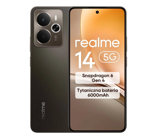 <h2>realme 14 5G 8/256GB Brązowy</h2>Poznaj smartfon realme 14 5G wspierany przez sztuczną inteligencję. To model stworzony z myślą o grach mobilnych, wysokiej wydajności i z baterią o bardzo długiej żywności – jest game changerem w swojej klasie! Procesor Qualcomm Snapdragon 6 Genn 4 zapewnia imponująco płynne i szybkie działanie telefonuBioniczny układ chłodzenia z komorą parową sprawia, że smartfon może działać długo na pełnych obrotachNorma szczelności IP68/IP69 (Ingress Protection) oznacza, że telefon jest chroniony przed czynnikami zewnętrznymiGT Boost Optymalizacja AI pod kątem gier sprawia, że rozrywka na smartfonie jest bardziej ekscytującaBateria o pojemności 6000 mAh - długie używanie na jednym ładowaniuZa pomocą aparatu 50MP z optyczną stabilizacją obrazu (OIS) zrobisz ultrawyraźne zdjęciaTopowe możliwości fotograficzne - wysokiej jakości zdjęcia oraz ich efektowna obróbka Wyświetlacz AMOLED (Active-Matrix Organic Light-Emitting Diode) 120Hz zapewnia ostry, dynamiczny obraz o optymalnie zbalansowanej kolorystyce. <h2>Poznaj realme 14 5G </h2> Szybki i maksymalnie wydajnySmartfon realme 14 5G został wyposażony w procesor Qualcomm Snapdragon 6 Gen4 o imponujących możliwościach. Dzięki niemu możesz korzystać z rozbudowanych aplikacji na telefon, oglądać na nim filmy i grać w zaawansowane gry. Wszystko to bez zacinania i irytujących opóźnień. Urządzenie będzie działać ultraszybko, nawet jeśli powierzysz mu wykonywanie wymagających zadań. Ekspert od trudnych wyzwańSzukasz smartfona, którego będziesz używać do korzystania z wymagających aplikacji i gier mobilnych? Oto on – model z bionicznym układem chłodzenia z komorą parową o powierzchni aż 6050mm². Dzięki takiej konstrukcji mechanizm nie przegrzewa się, gdy intensywnie eksploatujesz urządzenie, ponieważ potrafi błyskawicznie obniżyć temperaturę SoC nawet o 20˚C. Możesz jednocześnie uruchomić kilka dużych programów oraz długo ich używać bez obaw o uszkodzenie podzespołów. Szczelna konstrukcja Obudowa realme 14 5G ma normę szczelności IP68/IP69. Dzięki temu wewnętrzne mechanizmy smartfona są doskonalone chronione przed czynnikami zewnętrznymi. Niestraszna mu rozlana kawa, para wodna w łazience, a nawet wypadki przy basenie. Telefon wytrzyma do 2,5m głębokości i 30 minut pod wodą. Dlatego model ten sprawdzi się także podczas użytkowania w trudnych warunkach – nie zaszkodzą mu deszcz, mżawka czy drobiny kurzu. Model do gier mobilnychW realme 14 5G zastosowano GT Boost – optymalizację AI pod kątem wirtualnych rozgrywek. Sztuczna inteligencja poprawia parametr gry i udoskonala reakcje na gesty (dzięki AI Motion Control). Natomiast wyświetlacz AMOLED Esports 120 Hz zapewnia płynny, wyrazisty, łagodny dla oczu obraz o odpowiednim kontraście i jasności. To smartfon stworzony do wygrywania! Bateria o długiej żywotnościSmartfon realme 14 5G ma baterię o pojemności 6000 mAh. Co to oznacza w praktyce? Po jej naładowaniu do pełna nie musisz przez długie godziny ponownie podłączać urządzenia do prądu. W tym czasie możesz je intensywnie użytkować – grać, sprawdzać skrzynkę mailową czy nagrywać filmy. Jednocześnie bateria w tym smartfonie zachowuje do 80% swojej żywotności nawet po 1400 cyklach ładowania. Błyskawiczne ładowanie Wybierz urządzenie, które szybko wraca do życia po tym, jak jego bateria się wyczerpie. W realme 14 5G zapewnia to szybkie ładowanie SuperVOOC 45W. Natomiast dzięki zastosowanej w nim technologii Bypasss charging, która omija baterię podczas ładowania zasilając bezpośrednio smartfon. Funkcja ta sprawia, że telefon nie nagrzewa się i nie zacina podczas grania, a czas życia baterii zostaje wydłużony. Uruchomisz ją w trybie gamingowym. Dla miłośników fotografiiW tym smartfonie zastosowano wysokiej klasy aparat 50MP z optyczną stabilizacją obrazu (OIS). Uruchom go i zacznij robić zdjęcia oszałamiającej jakości. Za jego pomocą uwiecznisz ostre, wyraziste obrazy z doskonale widocznymi, najmniejszymi detalami. Będą to ujęcia idealne do wywołania i do publikacji w social mediach – zrobią ogromne wrażenie na Twoich obserwatorach. Topowe możliwości fotograficzneRobiąc zdjęcia aparatem w realme 14 5G, szybko docenisz jego topowe możliwości. Zastosowano w nim tryb Szybkiej Migawki AI, by móc uchwycić najbardziej dynamiczne ujęcia. Live Photo pozwala zatrzymać jednocześnie zarówno obraz, jak i ruch – za jego pomocą stworzysz krótkie filmy. Z kolei Gumka AI pozwala na usuwanie niepożądanych elementów z fotografii, a funkcja Wyraźna Twarz AI poprawia ich jakość. AI w trosce o Twój komfortSmartfon realme 14 5G został wyposażony w nowoczesne funkcje AI, które ułatwią Ci korzystanie z urządzenia. Inteligentna Pętla AI podpowie Ci, której aplikacji użyć w konkretnej sytuacji. Natomiast tryb Komfort Oczu AI automatycznie dostosuje temperaturę barw wyświetlacza, by chronić Twój wzrok i zapewnić Ci komfort w czasie używania telefonu. To urządzenie dostosowane do Twoich potrzeb! Realistyczny, wyrazisty obrazDzięki wyświetlaczowi AMOLED 120Hz zastosowanemu się w realme 14 5G odkryjesz nową jakość obrazu! Wykorzystana technologia sprawia, że każdy detal jest doskonale widoczny, a wszystkie sceny, filmy i rozgrywki wyróżniają się płynnością i nie zacinają się. To ekran klasy e-sportowej – spełni oczekiwania także wymagających gamerów, dla których liczą się najmniejsze szczegóły animacji. Niezwykłe wrażenia podczas gryRealme 14 5G to e-sportowy smartfon z funkcjonalną diodą powiadomień. Emituje ona efektowne, zwycięskie światło aureoli, które rozbłyśnie, gdy tylko Twoja wirtualna potyczka skończy się dla Ciebie sukcesem. To funkcja, która ucieszy wytrawnego i zapalonego gamera. Potęguje ona radość z wygrywania, a także sprawia, że urządzenie ma nowoczesny i typowo gamingo