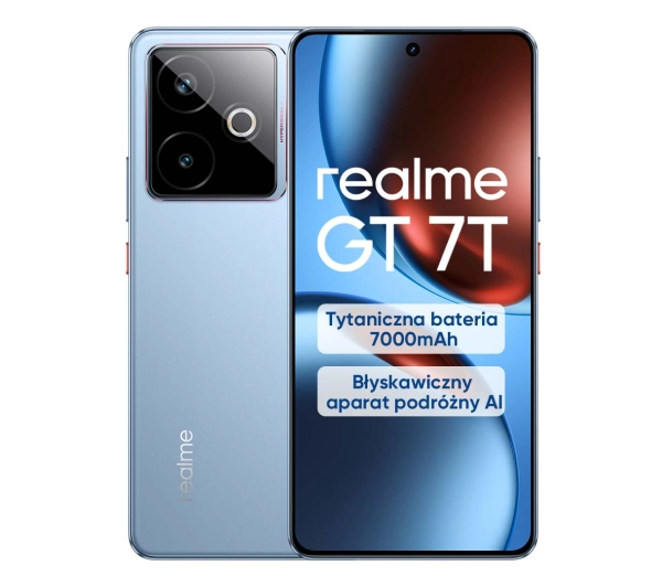 <h2>realme GT 7T 12/512 IceSense Blue Niebieski</h2>realme GT 7T to potężny i długo wyczekiwany smartfon z baterią 7000 mAh, ultraszybkim ładowaniem 120 W i wydajnym procesorem Dimensity 8400-MAX. Jest gotowy na wszystko – od intensywnej pracy po mobilne rozgrywki na najwyższych obrotach.Bateria 7000mAh zapewniająca nawet do dwóch dni ciągłej pracy, a do tego wygodne i superszybkie ładowanie 120WAparat główny 50MP z OIS oraz błyskawiczną migawką – świetne efekty spontanicznych sesji zdjęciowychInteligentne funkcje AI ułatwiające życie – intuicyjna pomoc każdego dniaNorma szczelności IP69 – odporność nawet na strumienie wody pod wysokim ciśnieniemProcesor Dimensity 8400-MAX dla maksymalnej wydajności urządzenia nawet pod dużym obciążeniemNiezwykle wyraźny i płynnie działający wyświetlacz AMOLED 120Hz z technologią Rainwater Smart Touch <h2>Poznaj smartfon realme GT 7T</h2> Imponujący czas pracySmartfon realme GT 7T redefiniuje pojęcie mobilnej wydajności dzięki imponującej baterii o pojemności aż 7000 mAh, która czyni go jednym z liderów w swojej klasie pod względem czasu pracy. W praktyce oznacza to nawet do dwóch dni intensywnego użytkowania bez konieczności podłączania do źródła zasilania! Dodatkowo, dzięki zastosowaniu anody krzemowej, bateria jest odporna na wysokie temperatury i ekstremalne zimno. Technologia szybkiego ładowania 120 W pozwala na uzupełnienie baterii do 50% w zaledwie 15 minut, które zapewnia energię na wiele godzin pracy. Bypassing podczas ładowaniaZaprojektowany z myślą o graczach realme GT 7T posiada funkcję bypassing podczas ładowania – zasilanie trafia bezpośrednio do komponentów telefonu, omijając baterię podczas grania. Technologia ta pozwala grać podczas ładowania z pełną mocą procesora i GPU, bez ryzyka przegrzania urządzenia czy throttlingu. Docenią ją szczególnie entuzjaści gier mobilnych, którzy spędzają długie godziny na intensywnych sesjach i potrzebują nieprzerwanej, stabilnej wydajności o każdej porze dnia. Profesjonalny aparat podróżny AI Urządzenie wyposażone zostało w aparat główny SONY IMX896 o rozdzielczości 50 MP z optyczną stabilizacją obrazu (OIS), zapewniający wyjątkową ostrość i stabilność zdjęć nawet w trudnych warunkach oświetleniowych. Posiada on tryb błyskawicznych zdjęć migawkowych, który został stworzony z inspiracji prac słynnych fotografów.Umożliwia on uchwycenie chwili bez żadnych opóźnień, a trzy kultowe style fotografii podróżniczej sprawią, że spontanicznemomenty z życia codziennego, podróży czy wydarzeń sportowych udomumentowane za pomocą realme GT 7T będą niezwykle wyraźne i oszałamiające. Wsparcie funkcji AISzereg inteligentnych funkcji opartych na sztucznej inteligencji realnie wpływa na komfort codziennego użytkowania smartfona realme GT 7T. Niezwykle przydatną nową funkcją jest AI Planner. Wystarczy dwukrotnie dotknąć tylnej obudowy, a sztuczna inteligencja dokładnie wyodrębni najważniejsze informacje z ekranu i automatycznie wygeneruje harmonogram. Otrzymasz ujednolicone przypomnienia o planach na dany dzień, aby bezproblemowo organizować czas. Ponad to w smartfonie znajdziemy cały wachlarz znanych i lubianych funkcji AI: Tłumacz AI, Trener Gier AI, Gumka AI, Inteligentna pętla AI, Zakreśl i znajdź, Studio AI. Norma szczelności IP68/69realme GT 7T może pochwalić się certyfikatem wodoszczelności i pyłoszczelności IP68/69 – zapewnia więc wysoki poziom ochrony. Urządzenie jest odporne na działanie strumieni wody pod wysokim ciśnieniem oraz wysoką temperaturę, co czyni je optymalnym wyborem dla osób aktywnych, pracujących w trudnych warunkach lub często przebywających na świeżym powietrzu. Możesz korzystać ze swojego smartfona bez obaw o jego uszkodzenie podczas pracy w zapylonym środowisku, na deszczu czy podczas uprawiania sportów. Smartfon z łatwością wytrzyma do 2,5m głębokości oraz 30 minut zanurzenia. Nowatorski procesorSercem realme GT 7T jest potężny procesor MediaTek Dimensity 8400-MAX oparty na 4-nanometrowej litografii TSMC, zapewniającej znakomitą wydajność przy zachowaniu niskiego zużycia energii. Układ ten działa płynnie nawet w wymagających zadaniach, takich jak gry AAA, edycja wideo 4K czy wielozadaniowa praca z aplikacjami. Zachwyca wynikami w teście AnTuTu, gdzie osiąga ponad 1 780 000. Idealny do gaminguZaprojektowany z myślą o intensywnym korzystaniu z gier mobilnych model realme GT 7T posiada zaawansowany system chłodzenia z komorą parową o powierzchni 7700 mm², działającą na zasadzie rozpraszania ciepła poprzez odparowywanie i kondensację cieczy. Obudowa urządzenia pokryta jest dodatkowo powłoką grafenową, znaną z doskonałych właściwości przewodzenia ciepła – umożliwia skuteczne odprowadzanie nadmiaru ciepła z komponentów wewnętrznych. Gry mobile są wspierane przez najnowsze rozwiązania dedykowane rozgrywkom e-sportowym. Gaming Coach obsługuje dwie przodujące gry FPS i MOBA, wykorzystując sztuczną inteligencję do wspomagania rozgrywki w celu analizowania sytuacji w grze i pomagania w awansowaniu. Twoją rozgrywkę usprawni również GT Mode oraz GT Boost. To technologia, która łączy innowacyjne usprawnienia wspomagane sztuczną inteligencją, powodując poprawę parametrów zaraz po uruchomieniu gry, co gwarantuje maksymalną szybkość reakcji za każdym razem. Wyświetlacz klasy kinowejWyświetlacz AMOLED o częstotliwości odświeżania 120 Hz i maksymalnej jasności 6000 nitów, wyróżnia się wyjątkową jasnością i wiernością kolorów, a także działa z Dolby Vision i HDR10+, prezentując zachwycający obraz. Umożliwia odtwarzanie wideo o jakości HDR z serwisu Netflix, zapewniając wciągającą rozrywkę, a niezwykle precyzyjna reakcja na dotyk gwarantuje płynną rozgrywkę bez opóźnień. Zastosowanie innowacyjnej technologii Rainwater Smart Touch spra