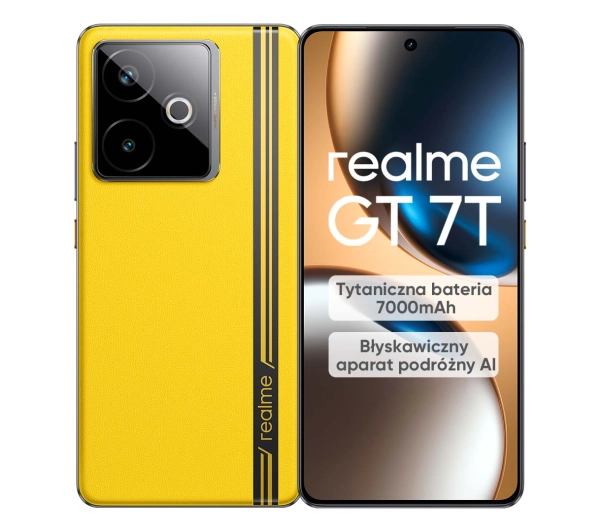 <h2>realme GT 7T 12/512 IceSense Yellow Żółty </h2>realme GT 7T to potężny i długo wyczekiwany smartfon z baterią 7000 mAh, ultraszybkim ładowaniem 120 W i wydajnym procesorem Dimensity 8400-MAX. Jest gotowy na wszystko – od intensywnej pracy po mobilne rozgrywki na najwyższych obrotach.Bateria 7000mAh zapewniająca nawet do dwóch dni ciągłej pracy, a do tego wygodne i superszybkie ładowanie 120WAparat główny 50MP z OIS oraz błyskawiczną migawką – świetne efekty spontanicznych sesji zdjęciowychInteligentne funkcje AI ułatwiające życie – intuicyjna pomoc każdego dniaNorma szczelności IP69 – odporność nawet na strumienie wody pod wysokim ciśnieniemProcesor Dimensity 8400-MAX dla maksymalnej wydajności urządzenia nawet pod dużym obciążeniemNiezwykle wyraźny i płynnie działający wyświetlacz AMOLED 120Hz z technologią Rainwater Smart Touch <h2>Poznaj smartfon realme GT 7T</h2> Imponujący czas pracySmartfon realme GT 7T redefiniuje pojęcie mobilnej wydajności dzięki imponującej baterii o pojemności aż 7000 mAh, która czyni go jednym z liderów w swojej klasie pod względem czasu pracy. W praktyce oznacza to nawet do dwóch dni intensywnego użytkowania bez konieczności podłączania do źródła zasilania! Dodatkowo, dzięki zastosowaniu anody krzemowej, bateria jest odporna na wysokie temperatury i ekstremalne zimno. Technologia szybkiego ładowania 120 W pozwala na uzupełnienie baterii do 50% w zaledwie 15 minut, które zapewnia energię na wiele godzin pracy. Bypassing podczas ładowaniaZaprojektowany z myślą o graczach realme GT 7T posiada funkcję bypassing podczas ładowania – zasilanie trafia bezpośrednio do komponentów telefonu, omijając baterię podczas grania. Technologia ta pozwala grać podczas ładowania z pełną mocą procesora i GPU, bez ryzyka przegrzania urządzenia czy throttlingu. Docenią ją szczególnie entuzjaści gier mobilnych, którzy spędzają długie godziny na intensywnych sesjach i potrzebują nieprzerwanej, stabilnej wydajności o każdej porze dnia. Profesjonalny aparat podróżny AI Urządzenie wyposażone zostało w aparat główny SONY IMX896 o rozdzielczości 50 MP z optyczną stabilizacją obrazu (OIS), zapewniający wyjątkową ostrość i stabilność zdjęć nawet w trudnych warunkach oświetleniowych. Posiada on tryb błyskawicznych zdjęć migawkowych, który został stworzony z inspiracji prac słynnych fotografów.Umożliwia on uchwycenie chwili bez żadnych opóźnień, a trzy kultowe style fotografii podróżniczej sprawią, że spontanicznemomenty z życia codziennego, podróży czy wydarzeń sportowych udomumentowane za pomocą realme GT 7T będą niezwykle wyraźne i oszałamiające. Wsparcie funkcji AISzereg inteligentnych funkcji opartych na sztucznej inteligencji realnie wpływa na komfort codziennego użytkowania smartfona realme GT 7T. Niezwykle przydatną nową funkcją jest AI Planner. Wystarczy dwukrotnie dotknąć tylnej obudowy, a sztuczna inteligencja dokładnie wyodrębni najważniejsze informacje z ekranu i automatycznie wygeneruje harmonogram. Otrzymasz ujednolicone przypomnienia o planach na dany dzień, aby bezproblemowo organizować czas. Ponad to w smartfonie znajdziemy cały wachlarz znanych i lubianych funkcji AI: Tłumacz AI, Trener Gier AI, Gumka AI, Inteligentna pętla AI, Zakreśl i znajdź, Studio AI. Norma szczelności IP68/69realme GT 7T może pochwalić się certyfikatem wodoszczelności i pyłoszczelności IP68/69 – zapewnia więc wysoki poziom ochrony. Urządzenie jest odporne na działanie strumieni wody pod wysokim ciśnieniem oraz wysoką temperaturę, co czyni je optymalnym wyborem dla osób aktywnych, pracujących w trudnych warunkach lub często przebywających na świeżym powietrzu. Możesz korzystać ze swojego smartfona bez obaw o jego uszkodzenie podczas pracy w zapylonym środowisku, na deszczu czy podczas uprawiania sportów. Smartfon z łatwością wytrzyma do 2,5m głębokości oraz 30 minut zanurzenia. Nowatorski procesorSercem realme GT 7T jest potężny procesor MediaTek Dimensity 8400-MAX oparty na 4-nanometrowej litografii TSMC, zapewniającej znakomitą wydajność przy zachowaniu niskiego zużycia energii. Układ ten działa płynnie nawet w wymagających zadaniach, takich jak gry AAA, edycja wideo 4K czy wielozadaniowa praca z aplikacjami. Zachwyca wynikami w teście AnTuTu, gdzie osiąga ponad 1 780 000. Idealny do gaminguZaprojektowany z myślą o intensywnym korzystaniu z gier mobilnych model realme GT 7T posiada zaawansowany system chłodzenia z komorą parową o powierzchni 7700 mm², działającą na zasadzie rozpraszania ciepła poprzez odparowywanie i kondensację cieczy. Obudowa urządzenia pokryta jest dodatkowo powłoką grafenową, znaną z doskonałych właściwości przewodzenia ciepła – umożliwia skuteczne odprowadzanie nadmiaru ciepła z komponentów wewnętrznych. Gry mobile są wspierane przez najnowsze rozwiązania dedykowane rozgrywkom e-sportowym. Gaming Coach obsługuje dwie przodujące gry FPS i MOBA, wykorzystując sztuczną inteligencję do wspomagania rozgrywki w celu analizowania sytuacji w grze i pomagania w awansowaniu. Twoją rozgrywkę usprawni również GT Mode oraz GT Boost. To technologia, która łączy innowacyjne usprawnienia wspomagane sztuczną inteligencją, powodując poprawę parametrów zaraz po uruchomieniu gry, co gwarantuje maksymalną szybkość reakcji za każdym razem. Wyświetlacz klasy kinowejWyświetlacz AMOLED o częstotliwości odświeżania 120 Hz i maksymalnej jasności 6000 nitów, wyróżnia się wyjątkową jasnością i wiernością kolorów, a także działa z Dolby Vision i HDR10+, prezentując zachwycający obraz. Umożliwia odtwarzanie wideo o jakości HDR z serwisu Netflix, zapewniając wciągającą rozrywkę, a niezwykle precyzyjna reakcja na dotyk gwarantuje płynną rozgrywkę bez opóźnień. Zastosowanie innowacyjnej technologii Rainwater Smart Touch sp