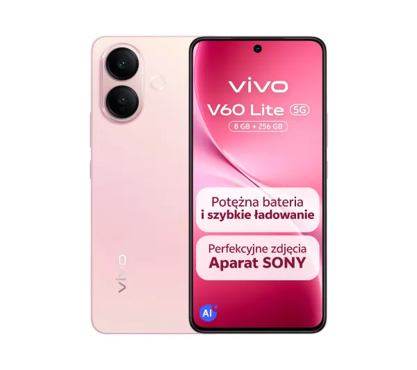 <h2>vivo V60 Lite 5G 8/256 Różowy</h2>Smartfon vivo V60 Lite 5G to urządzenie wyposażone w pojemną baterię 6500 mAh oraz wydajny procesor, dzięki którym działa niezawodnie nawet przy intensywnym użytkowaniu. Szeroka gama funkcji AI (sztuczna inteligencja) pozwala na tworzenie profesjonalnych zdjęć i ułatwia codzienne zadania.Bateria 6500 mAh z systemem szybkiego ładowania 90W FlashCharge zapewnia energię nawet na 27 godzin ciągłego oglądania filmówAparat główny 50 MP SONY IMX882 wspierany funkcjami sztucznej inteligencji odpowiada za wysoką jakość zdjęćOświetlenie portretowe AI Aura Light 2.0 pozwala na optymalne rozproszenie światła na twarzy fotografowanej osobyWzmocnione szkło Shield Glass oraz odporność na wodę i pył IP65 przekłada się na niezawodność nawet w trudnych warunkachFunkcje AI ułatwiają planowanie, wyszukiwanie informacji i automatyzowanie codziennych zadańZaawansowana edycja zdjęć z wykorzystaniem narzędzi sztucznej inteligencjiProcesor 4nm MediaTek Dimensity 7360 Turbo działa płynnie i wydajnie oraz zapewnia szybkie przełączanie pomiędzy aplikacjamiBezproblemowa i nieprzerwana łączność bezprzewodowa nawet w miejscach o słabym zasięgu, dzięki funkcji AI Super Link<h2>Poznaj smartfon vivo V60 Lite 5G</h2> Potężny akumulator z szybkim ładowaniemW smukłej, stylowej i eleganckiej obudowie smartfona vivo V60 Lite 5G kryje się pojemna bateria BlueVolt o pojemności 6500 mAh. Zapewnia ona aż 27 godzin oglądania filmów i seriali online bez przerwy! Do tego wyróżnia się wysoką odpornością na upływ czasu – przez 5 lat standardowego użytkowania zachowuje ponad 80% swojej pierwotnej pojemności. Urządzenie zostało też wyposażone w technologię szybkiego ładowania 90W FlashCharge, dzięki której w zaledwie 52 minuty uzupełnisz jego energię od 1% do 100%. Profesjonalny aparatUchwyć swoje wspomnienia na wysokiej jakości zdjęciach! To możliwe z aparatem głównym 50 MP SONY IMX882, który znajdziesz w urządzeniu vivo V60 Lite 5G. Jeśli chcesz uwiecznić panoramę, użyj aparatu szerokokątnego, a gdy przyjdzie czas na selfie – skorzystaj z aparatu przedniego 32 MP. Ulepszony algorytm sztucznej inteligencji AI Master HD (High Definition) odpowiada za prawidłową ekspozycję oraz poprawę jakości zdjęć nocnych. Dzięki temu masz pewność, że Twoje zdjęcia wyjdą profesjonalnie w każdych warunkach! Wysokiej jakości portretyZamiast typowej lampy błyskowej, w vivo V60 Lite 5G zastosowano oświetlenie portretowe AI Aura Light 2.0. Powiększony obszar emisji światła w kształcie pierścienia zapewnia jego optymalne rozproszenie na twarzy fotografowanej osoby. Pozwala to uniknąć prześwietlenia zdjęć i nadaje im profesjonalny styl. Natężenie i odcień światła możesz precyzyjnie dopasować do warunków dzięki płynnej regulacji. Wytrzymały i odpornyvivo V60 Lite 5G posiada w standardzie wzmocnione szkło Shield Glass, które chroni ekran przed uszkodzeniem. Zastosowano w nim kompleksową strukturę amortyzującą, dzięki czemu urządzenie spełnia militarny standard wytrzymałości i uzyskało certyfikat odporności na upadki SGS (międzynarodowa jednostka certyfikująca). Posiada też klasę IP65 (standard ochrony), która potwierdza jego zabezpieczenie przed wodą i pyłem. Funkcje sztucznej inteligencjiModel vivo V60 Lite 5G wykorzystuje narzędzia bazujące na AI, aby usprawnić Twoje codzienne zadania – tworzenie notatek, nagrywanie notatek głosowych czy tłumaczenie ekranu. Wyszukiwanie kontekstowe „zakreśl, aby wyszukać” ułatwia szybkie znajdowanie informacji, a asystent AI Google Gemini wesprze Cię w planowaniu, generowaniu treści czy obrazów. Zaawansowana edycja zdjęćKorzystaj z funkcji sztucznej inteligencji, aby udoskonalać swoje fotografie. Odbicie od szkła zepsuło zdjęcie? Nic straconego! Użyj funkcji „usuń za pomocą AI 3.0” we wbudowanym w galerię narzędziu Studio Edycji AI, by naprawić kadr. Smartfon vivo V60 Lite 5G umożliwia też wymazywanie niechcianych refleksów, usuwanie zbędnych obiektów czy przypadkowych osób z tła. Płynne i wydajne działanieZaawansowany procesor 4nm MediaTek Dimensity 7360 Turbo zapewnia szybką pracę smartfona nawet przy wielu aplikacjach uruchomionych jednocześnie. Zoptymalizowany system pozwala na płynne działanie urządzenia bez opóźnień aż przez 5 lat używania. Wysoką wydajność oraz inteligentny system chłodzenia docenią w szczególności gracze i użytkownicy wymagających aplikacji. Bezproblemowa łącznośćUrządzenie vivo V60 Lite 5G korzysta z ulepszonego Wi-Fi (komunikacja bezprzewodowa), aby zapewnić Ci nieprzerwany kontakt ze znajomymi i rodziną tam, gdzie zasięg jest słaby. Dzięki funkcji wyboru sieci AI oraz antenie 360° zaprojektowanej z myślą o uzyskaniu mocnego sygnału możesz pozostać w kontakcie ze światem nawet w miejscach, w których inni tracą zasięg!<h2>Zawartość opakowania vivo V60 Lite 5G</h2>W opakowaniu Smartfon Etui Folia ochronna (naklejona) Igła do tacki SIM (Subscriber Identity Module) Kabel USB-C/USB-A (Universal Serial Bus Type-C / Universal Serial Bus Type-A) Instrukcja obsługivivo – marka godna zaufaniaFunkcjonalne i nowoczesne urządzeniaZnany producent innowacyjnych smartfonów i słuchawekNa rynku od dekadGlobalna marka z chińskimi korzeniami założona w 1995 rokuStale rosnący zasięgProdukty dostępne w ponad 60 krajach