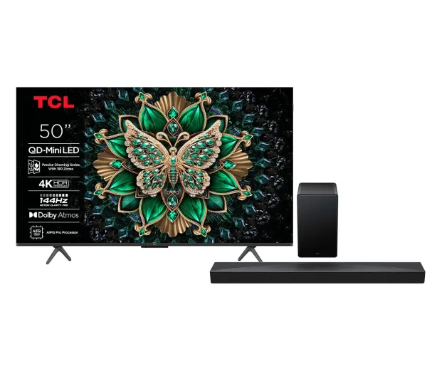 Telewizor TCL 50C6K 50" QD-Mini LED 4K 144Hz Google TV Dolby Vision IQ Dolby Atmos HDMI 2.1 DVB-T2 + Soundbar TCL Q65H