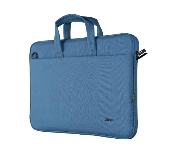 Trust Bologna - Eko Torba na laptopa 16'' w kolorze niebieskim Komfort i bezpieczeństwoGłówna przegroda wyściełana jest niezwykle miękką wyściółką z mikrofibry, dzięki czemu możesz być spokojny, że Twój sprzęt jest bezpieczny. Torba Bologna łączy w sobie wygodę z trwałością i bezpieczeństwem.FunkcjonalnośćTorba Bologna jest wymyślona w taki sposób, aby umożliwić Ci prosty dostęp zarówno do laptopa jak i dokumentów. Lubisz nosić torbę w ręku używając uchwytu? A może wolisz korzystać z odpinanego i regulowanego paska i nosić ją na ramieniu? To nie ważne, ponieważ torba została zaprojektowana w taki sposób, aby spełnić oczekiwania każdego użytkownika. Dodatkowo jeśli oprócz laptopa chcesz spakować akcesoria to teraz też możesz to zrobić. Umożliwi Ci to wygodna przednia kieszeń zapinana na zamek.W trosce o środowiskoDo stworzenia torby Bologna użyto aż 11 butelek PET, które zostały poddane recyklingowi. Korzystając z tej torby możesz mieć pewność, że została wykonana z ekologicznych materiałów, a Ty dokonałeś słusznego wyboru.