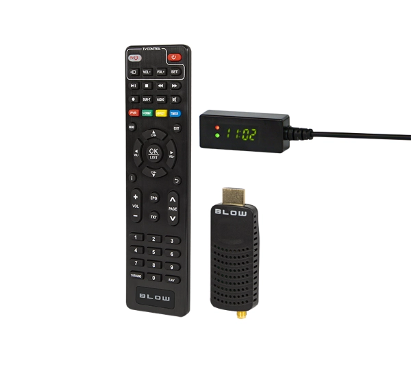 <h2>Dekoder tuner BLOW 7000FHD MINI TV Stick</h2><p>Nowoczesny tuner TV Stick w wersji MINI do odbioru cyfrowej telewizji naziemnej w standardzie DVB-T2 (Digital Video Broadcasting – Second Generation Terrestrial) / HEVC (High Efficiency Video Coding) / H.265. Kompaktowe wymiary pozwalają na dyskretny montaż za telewizorem, bez zajmowania dodatkowego miejsca. W zestawie znajduje się wyświetlacz zwiększający wygodę użytkowania.</p><h3>Mini dekoder o wielkich możliwościach</h3><p>BLOW 7000FHD MINI to nowoczesny tuner DVB-T2 / DVB-C z obsługą HEVC H.265, który zapewnia najwyższą jakość obrazu Full HD i czysty dźwięk.</p><p>Mimo kompaktowych rozmiarów działa jak klasyczny dekoder – odbiera wszystkie dostępne multipleksy (MUX1, MUX2, MUX3, MUX4, MUX8), obsługuje funkcje PVR (Personal Video Recorder), TimeShift i EPG (Electronic Program Guide), a dzięki gniazdu USB pełni także rolę odtwarzacza multimediów.</p><h3>Obraz w jakości Full HD</h3><p>Ciesz się wyraźnym obrazem i doskonałym dźwiękiem w najnowszym standardzie DVB-T2 HEVC.</p><h3>Funkcje nagrywania i pauzy</h3><p>Zatrzymaj, przewiń i nagraj swoje ulubione programy dzięki PVR i TimeShift.</p><h3>Multimedialne centrum rozrywki</h3><p>Podłącz pendrive i oglądaj filmy, zdjęcia lub słuchaj muzyki bezpośrednio na telewizorze.</p><h3>Wygoda i prostota użytkowania</h3><p>Dekoder możesz łatwo ukryć za telewizorem, a niewielki, czytelny wyświetlacz z odbiornikiem IR zamontować z przodu, aby w każdej chwili widzieć numer kanału lub aktualną godzinę. Obsługa jest wyjątkowo prosta – wszystkie funkcje dostępne są z poziomu jednego pilota, który dodatkowo może sterować telewizorem, eliminując konieczność używania kilku urządzeń.</p><p>Instalacja przebiega błyskawicznie i nie wymaga żadnych specjalistycznych umiejętności. Możliwość ustawienia wyświetlacza w dogodnym miejscu sprawia, że korzystanie z dekodera jest maksymalnie wygodne i estetyczne. Dzięki temu możesz cieszyć się pełną funkcjonalnością i komfortem obsługi bez zbędnego bałaganu.</p><h4>Kompaktowy rozmiar</h4><p>Mini dekoder, który zmieści się za telewizorem, zachowując pełną funkcjonalność.</p><h4>Uniwersalna kompatybilność</h4><p>Obsługuje DVB-T2, DVB-C, H.264 i H.265, gwarantując pełną zgodność z nowym standardem.</p><h4>Jeden pilot do wszystkiego</h4><p>Programowalne przyciski umożliwiają sterowanie zarówno dekoderem, jak i telewizorem.</p><h4>Gotowy zestaw do podłączenia</h4><p>W komplecie znajdziesz wszystkie akcesoria – pilot, baterie, przejściówkę HDMI i wyświetlacz IR.</p>