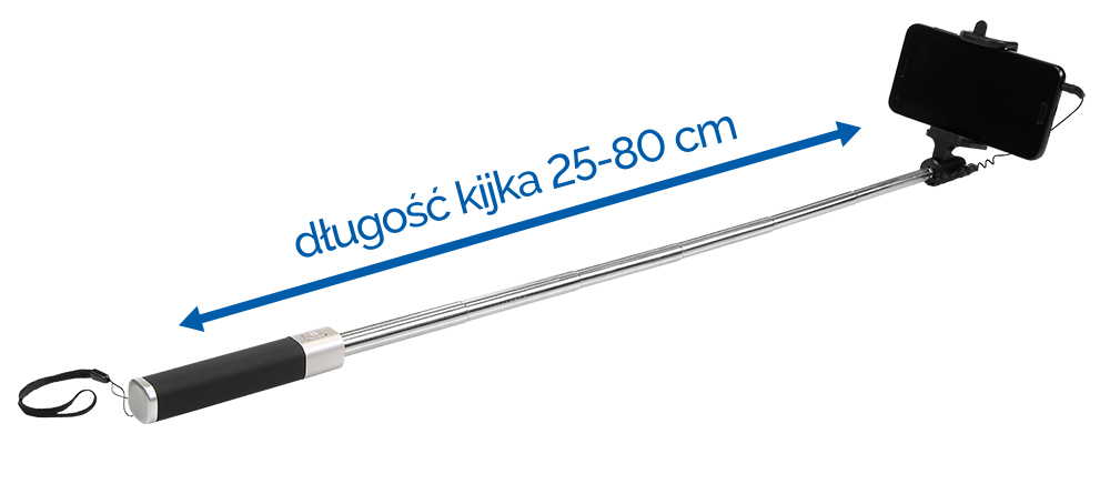 <p>Wsparcie iOS i Android</p><p>Połączenie przez 3,5 mm audio jack</p><p>Zintegrowana migawka</p><p>Silikonowy uchwyt, smycz w komplecie</p><p>Regulacja 270°</p><p>T-Rex approved!</p><p>Pasuje do smartfonów o przekątnej 4 - 6,4"</p><p>Długość kijka 25 - 80 cm</p> <p>Kompaktowy, składany uchwyt do selfie pozwala na robienie autoportretów z szerokiej perspektywy. Dzięki teleskopowej rączce można na jednym zdjęciu uchwycić większą grupę ludzi lub szeroki krajobraz, a rękojeść wykonana z silikonu syntetycznego oraz krótka smyczka wyeliminuje niebezpieczeństwo wyślizgnięcia się kijka z ręki i ułatwi przenoszenie. Proste połączenie telefonu z uchwytem poprzez przewód audio jack 3,5 mm. To proste rozwiązanie dla tych, którzy nie chcą pamiętać o ładowaniu selfie.Jest to niezastąpiony gadżet wakacyjno-urlopowy.</p> <p> </p><ul> <li>Połączenie z telefonem przez złącze 3,5 mm audio jack</li> <li>Pasuje do telefonów o przekątnej 4 - 6,4"</li> <li>Długość kijka 25 - 80 cm</li> <li>Obrotowa głowica, która umożliwia zmianę położenia smartfona nawet o 270°</li> <li>Zintegrowany z trzonem spust migawki</li> <li>Ergonomiczny przycisk</li> <li>Rękojeść wykonana z silikonu syntetycznego</li> <li>Kolor: czarny</li></ul><p> </p><p> </p><ul> <li>Połączenie z telefonem przez złącze 3,5 mm audio jack</li> <li>Pasuje do telefonów o przekątnej 4 - 6 "</li> <li>Długość kijka 19 - 80 cm</li> <li>Obrotowa głowica, która umożliwia zmianę położenia smartfona nawet o 270°</li> <li>Zintegrowany z trzonem spust migawki</li> <li>Ergonomiczny przycisk</li> <li>Wspierany system operacyjny iOS (5 lub nowszy) oraz Android (3.0 lub nowszy)</li> <li>Maksymalne obciążenie - 500g</li> <li>Rękojeść wykonana z silikonu syntetycznego</li> <li>Kolor: czarny</li></ul><p> </p>