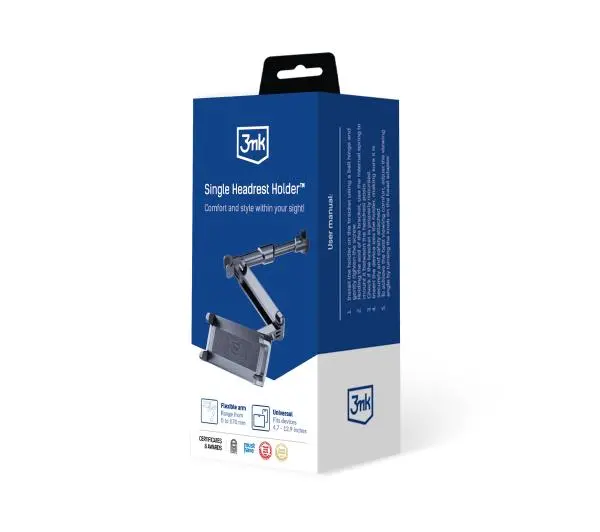 <h2>3mk Single Headrest Holder</h2><p>Komfort i styl w zasięgu Twojego wzroku!Uniwersalność – uchwyt do urządzeń przenośnych z ekranami o przekątnej 4,7”-12,9”Ruchome ramię - możliwość precyzyjnego dostosowania odległości wpiętego urządzeniaRegulowana szerokość - możliwość zamontowania praktycznie każdego tabletu i telefonuSzeroka kompatybilność – dopasowanie do zagłówków o szerokości 105-150 mmŁatwość montażu - prosta i szybka instalacja bez konieczności demontowania zagłówkaWszechstronność – stwarzanie komfortowych warunków do pracy i rozrywki</p><h3>Uniwersalny uchwyt na zagłówek</h3><p>3mk Single Headrest Holder pasuje do wszystkich modeli smartfonów i tabletów z ekranami o przekątnej od zaledwie 4,7 do rekordowych 12,9 cala! W holderze można bez przeszkód zamontować nawet tablet iPad Pro! To wyjątkowo przydatne rozwiązanie dla osób, które w czasie podróży samochodem często używają telefonu lub tabletu do pracy, nauki czy rozrywki i chcą poprawić komfort obsługi urządzenia.</p><h3>Ruchome ramię</h3><p>Dzięki wyposażeniu konstrukcji w ruchome ramię (zakres 0-170 mm), 3mk Single Headrest Holder pozwala na elastyczne dostosowanie odległości uchwytu od zagłówka. Użytkownik ma możliwość ustawienia telefonu lub tabletu w najwygodniejszym dla siebie miejscu. Ogląda filmy, pracuje nad ofertą handlową lub gra w grę w optymalnych warunkach.</p><h3>Regulowana szerokość</h3><p>W 3mk Single Headrest Holder nie tylko ramię jest regulowane, ale również szerokość mocowania. Holder bez problemu daje się dopasować do wymiarów montowanego urządzenia. Regulacja w zakresie od 118 do aż 250 mm gwarantuje elastyczność na miarę praktycznie każdego telefonu czy tabletu.</p><h3>Dopasowanie do zagłówka</h3><p>3mk Single Headrest Holder pasuje do większości zagłówków w samochodach osobowych - niezależnie od marki, modelu czy wersji wyposażenia pojazdu. Holder oferuje bardzo szeroką kompatybilność. Pasuje do zagłówka o szerokości min. 105 mm i max. 150 mm. Jego montaż jest prosty dla każdego.</p><h2>Prosta instalacja i bezpieczeństwo</h2><p>3mk Single Headrest Holder instaluje się szybko i bezproblemowo. Nie trzeba demontować zagłówka. Wystarczy chwila, aby cieszyć się nieznanym wcześniej komfortem podróżowania oraz maksymalnym bezpieczeństwem mocowania. Uchwyt zapewnia stabilny chwyt także na ostrych zakrętach i wyboistych drogach.</p>