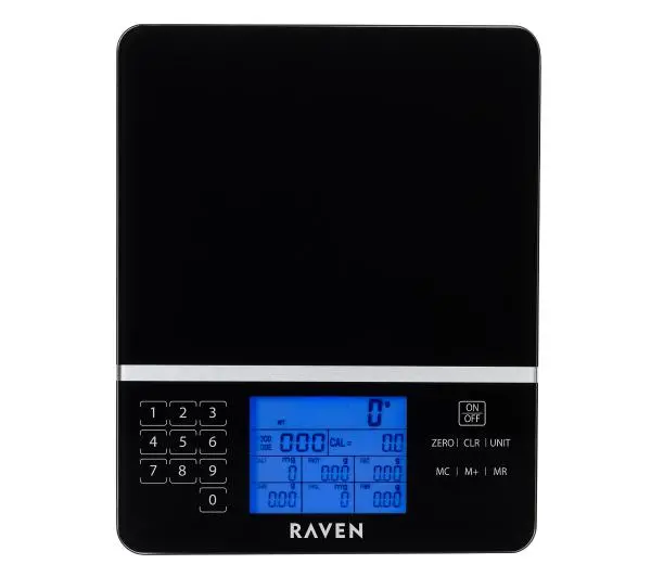 Analiza wartości odżywczychSprawdź, co jesz! Waga kuchenna dietetyczna RAVEN EWK006 wyświetla zawartość: kalorii, soli, białka, tłuszczu, węglowodanów, cholesterolu i błonnika w ważonych produktach. Dzięki temu możesz świadomie komponować swój jadłospis. W zestawie znajduje się baza kodów, która umożliwia dokładną analizę wielu produktów i potraw.Wybór jednostek miarWagę wyposażono w możliwość wyboru preferowanej jednostki miary, np. g, kg, oz. Ułatwia to korzystanie z przepisów z anglosaskich książek kucharskich.Maksymalne obciążenie 5000 gMaksymalne obciążanie wagi RAVEN to aż 5000 g. Dzięki temu poradzi sobie ona z większością produktów używanych w kuchni.Funkcja tarowaniaDzięki funkcji tarowania możesz określić masę produktu bez jego opakowania lub naczynia, w którym się znajduje.