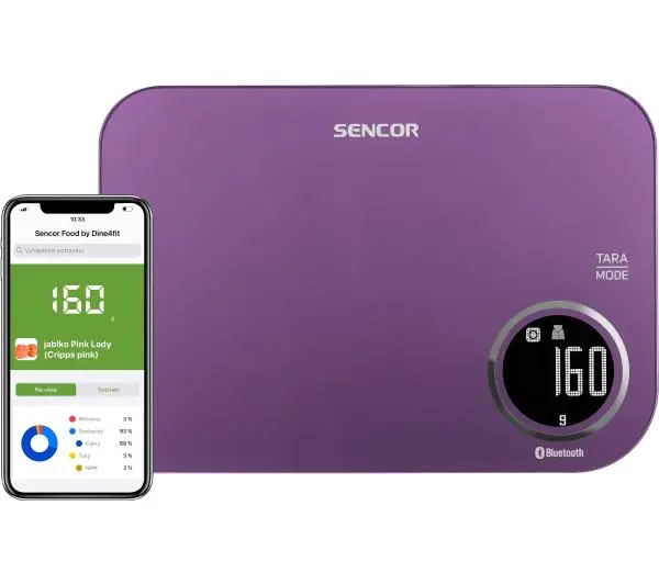 SKS 7073VTINTELIGENTNA DIETETYCZNAWAGA KUCHENNA Z BLUETOOTH Waga kuchenna, która pozwala zachować kontrolę nad ilością spożywanych kalorii Autorska darmowa aplikacja Sencor FOOD dostępna dla iOS i Android Pokazuje dokładne parametry ważonego produktu Została wyposażona w wyświetlacz LCD Można na niej zważyć jednorazowo do 5 kg żywności z dokładnością 1 gramaNowoczesne funkcje i przemyślany design w jednym urządzeniu Dietetyczna waga kuchenna firmy Sencor to urządzenie, które z pewnością przypadnie do gustu sportowcom, zwolennikom zdrowego stylu życia i osobom, które chcą mieć pod kontrolą liczbę spożywanych kalorii i składników odżywczych.Waga kuchenna może być podłączona do darmowej autorskiej aplikacji Sencor, gdzie można znaleźć wiele szczegółowych danych dotyczących ważonej żywności. Darmowa autorska aplikacja Sencor FOODDzięki aplikacji Sencor FOOD możesz zapisywać on‑line wszystkie pomiary żywności. Aplikacja jest zintegrowana dodatkowo z płatną aplikacją Dine4fit, dzięki której możesz zyskać dostęp do informacji o składnikach odżywczych w produktach, które ważysz na wadze Sencor. Dane w aplikacje pochodzą z tabeli kalorii, która aktualizowana na bieżąco. Dwa tryby ważeniaWyświetlanie wagi aktualnie ważonego produktu jest możliwe w trybie "na wadze". Podczas wykorzystywania tego trybu można też sprawdzić informacje na temat wartości odżywczych w ważonym produkcie zgodnie z jego masą. Drugi dostępny tryb "lista" pozwala na łatwiejsze przygotowywanie posiłków według przepisów. W tym trybie możliwe jest dodawanie kolejnych składników do przygotowywanej potrawy, co pozwala zachować większą kontrolę nad ilością kalorii oraz wartością odżywczą całego posiłku. Doważanie produktów w funkcji TARADzięki inteligentnej funkcji TARA możliwe jest wyzerowanie wagi oraz doważenie innych składników bez konieczności opróżniania naczynia, które jest wykorzystywane do ważenia składników. Po wciśnięciu przycisku tej funkcji nie zostanie uwzględniona waga pojemnika. Poznaj zalety inteligentnej wagi kuchennej z bluetooth Duży, kontrastowy i okrągły wyświetlacz LCD Gładka powierzchnia do ważenia i pomiaru produktów Przycisk funkcji zerowania TARA Przycisk służący do przełączania trybu ważenia i pomiaru masy MODE Duży, kontrastowy i okrągły wyświetlacz LCD Gładka powierzchnia do ważenia i pomiaru produktów Przycisk funkcji zerowania TARA Przycisk służący do przełączania trybu ważenia i pomiaru masy MODE Przełączanie między trzema trybami pracyWagę wyposażono w trzy tryby pracy: ważenie, pomiaru objętości wody lub pomiaru objętości mleka. W celu przełączenia trybów wystarczy nacisnąć i przytrzymać przycisk funkcji TARA/MODE. Czytelny i kontrastowy wyświetlacz LCDW dolnym rogu urządzenia umieszczono duży czytelny wyświetlacz LCD, na którym cyfry o wysokości 2 centymetrów dla poprawy widoczności wyświetlają się na kontrastowym czarnym tle. Waga kuchenna Sencor poza masą produktów pokazuje też komunikat o przeciążeniu. Łatwe czyszczenie dzięki minimalistycznemu designowiKonstrukcja wagi kuchennej Sencor została dokładnie przemyślana, więc cechuje się minimalistycznym designem, który znacznie ułatwia utrzymanie urządzenia w czystości. Waga ma jednolitą płaską powierzchnię bez żadnych wyżłobień, w których mogłyby pozostawiać resztki żywności. Aby ją wyczyścić, wystarczy użyć delikatnej lekko wilgotnej ściereczki lub papierowego ręcznika.Do wyboru aż dziewięćwersji kolorystycznych: Inteligentną wagę kuchenną Sencor wyróżnia m.in.: Autorska aplikacja Sencor FOOD i kompatybilność z aplikacją Dine4Fit Obciążenie maksymalne wynoszące 5 kg Dokładność pomiaru do 1 g/1 oz 3 tryby: ważenia, pomiaru objętości mleka i pomiaru objętości wody Funkcja przełączania między jednostkami metrycznymi (gramy i mililitry) i imperialnymi (lb: oz / fl’oz) Możliwość włączenia urządzenia obciążenie powierzchni ważenia lub naciśnięcie Energooszczędność dzięki automatycznemu wyłączaniu w przypadku bezczynności Dane techniczne: Funkcja doważania: TAK Maksymalne obciążenie: 5 kg (z dokładnością pomiaru do 1 g/1 oz) Wskaźnik przeciążenia: TAK Automatyczne wyłączanie w przypadku bezczynności: TAK Tryby: ważenie/pomiar ilości mleka/pomiar ilości wody Funkcja przełączania jednostek: TAK Rodzaje jednostek: g/ml, lb:oz/fl.oz Tryby ważenia: „na wadze” i „lista” Zasilanie: poprzez baterie (2 x 1,5 V AAA) Wskaźnik słabej baterii: TAK Zawartość opakowania Inteligentna waga kuchenna z Bluetooth SKS 7073VTBaterieInstrukcja obsługi w języku polskim Najczęściej zadawane pytania Jak jest zasilana inteligentna waga kuchenna Sencor?Wagę kuchenną Sencor zasilają dwie baterie 1,5 V AAA, które znajdziesz w zestawie z urządzeniem.W jaki sposób sparować wagę kuchenną ze smartfonem za pomocą aplikacji Sencor FOOD?W celu sparowania wagi kuchennej Sencor ze smartfonem za pomocą bluetooth w pierwszej kolejności należy pobrać na telefon aplikację Sencor FOOD i włączyć w urządzeniu funkcję bluetooth. Po uruchomieniu aplikacji nastąpi automatyczne połączenie. W przypadku gdy aplikacja w smartfonie nie znajdzie wagi, to wyświetli się komunikat o ponowieniu próby połączenia.Czy waga kuchenna z bluetooth firmy Sencor jest kompatybilna z systemem iOS i Android?Tak, inteligentna waga kuchenna Sencor może być wykorzystywana w połączeniu z aplikacją zarówno na urządzeniach z systemem iOS, jak i Android.Jakie informacje są przesyłane między wagą kuchenną a smartfonem za pośrednictwem bluetooth?Waga kuchenna przesyła do aplikacji zainstalowanej na smartfonie informacje o wadze mierzonego produktu, składnikach odżywczych i inne dane o ważonym produkcie.Czy istnieje możliwość zsynchronizowania wagi kuchennej z innymi aplikacjami?Tak, waga kuchenna Se