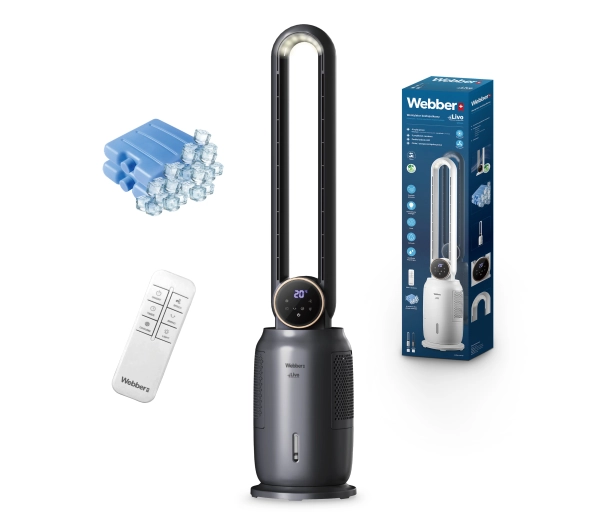 Webber – urządzenia agd do domu WEBBER LIVO WB1840G<p>Stylowy wentylator bezłopatkowy 4w1: chłodzi, nawilża, jonizuje i zapewnia przyjemną cyrkulację powietrza. Teraz w eleganckim, grafitowym wydaniu – doskonały wybór dla nowoczesnych wnętrz.</p> <h2>Wentylator bezłopatkowy Webber LIVO WB1840G (grafitowy)</h2><h3>Chłodzące wkłady i zdalne sterowanie</h3><p>Dołączone do zestawu wkłady chłodzące można łatwo zamrozić i włożyć do zbiornika, co znacząco poprawia skuteczność działania w upalne dni. Poręczny pilot umożliwia zdalne zarządzanie funkcjami bez potrzeby podchodzenia do urządzenia.</p><h3>Wielozadaniowe działanie</h3><p>Model WB1840G pełni funkcję wentylatora, chłodzenia, nawilżacza oraz jonizatora. Wszechstronność, która pozwala zadbać o jakość powietrza w pomieszczeniu przez cały rok.</p><h3>Obrót 70° i nastrojowe światło LED</h3><p>Dzięki funkcji automatycznego obrotu, wentylator rozprowadza powietrze w szerokim zakresie. Subtelne oświetlenie LED dodaje mu elegancji i zapewnia przyjemną atmosferę wieczorem.</p><h3>Regulowany nawiew</h3><p>Trzy stopnie intensywności nawiewu umożliwiają precyzyjne dopasowanie działania wentylatora – od lekkiego orzeźwienia po silny podmuch na naprawdę gorące dni.</p><h3>Praca bez hałasu, z oszczędnością energii</h3><p>Technologia zastosowana w modelu WB1840G zapewnia bardzo cichą pracę, dzięki czemu idealnie sprawdza się podczas snu lub pracy. Niskie zużycie prądu to dodatkowy atut.</p><h3>Nowoczesna forma i bezpieczeństwo</h3><p>Brak łopatek oznacza bezpieczeństwo użytkowania w obecności dzieci i zwierząt, a jednocześnie ułatwia czyszczenie. Grafitowy kolor dodaje urządzeniu nowoczesnego, industrialnego charakteru.</p><h3>Wyświetlacz LED i unikalny wygląd</h3><p>Elegancki wygląd w ciemnym odcieniu grafitu wyróżnia się w każdej przestrzeni – od stylowego biura po nowoczesny salon. Czytelny ekran LED informuje o bieżących ustawieniach urządzenia.</p><h3>Doskonały do każdego pomieszczenia</h3><p>WB1840G to urządzenie, które odnajdzie się wszędzie – w pokoju dziennym, sypialni, gabinecie czy przestrzeni dziecięcej. Smukły profil i funkcjonalność czynią go niezastąpionym w upalne dni.</p> <h2>Co znajdziesz w zestawie?</h2> <h5>W zestawie:</h5><ul> <li>Wentylator Webber Livo WB1840G (grafitowy)</li> <li>Pilot do zdalnego sterowania</li> <li>2 wkłady chłodzące</li> <li>Instrukcja obsługi</li></ul> <p>© 2025 Webber. Wszystkie prawa zastrzeżone.</p>