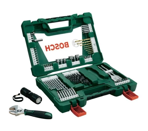 Zestaw osprzętu Bosch V-Line zawiera aż 83 elementy: wiertła tytanowe i końcówki wkręcające z wkrętakiem grzechotkowym i teleskopowym wskaźnikiem magnetycznym, lampka LED, klucz francuski.Zestaw zawiera:<ul> <li>8 wierteł do metalu HSS-R:2/2/2,5/3/3/4/5/6</li> <li>10 wierteł widiowych do cegły, muru: 3/4/5/5,5/5,5/6/6/7/8/10</li> <li>8 wierteł do drewna: 3/4/5/6/6/7/8/10</li> <li>13 końcówek wkręcających o długości 50 mm PH 0/1/2/3; PZ 0/1/2/3; S 5 T 15/20; H 5/6</li> <li>32 końcówki wkrętarskie o dł. 25mm: PH 0/0/1/1/2/2/3/3; PZ 0/0/1/1/2/2/3/3; S 4/5/6; T 10/10/15/15/20/20/25/25/30/40; Hex 4/5/6</li> <li>6 kluczy: 6/7/8/10/12/13mm</li> <li>Wiertła płaskie: 16/20 mm</li> <li>1 przedłużacz magnetyczny do końcówek</li> <li>1 rozwiertak – pogłębiacz otworów</li> <li>Klucz francuski</li> <li>Latarka LED</li> <li>Walizka</li></ul>