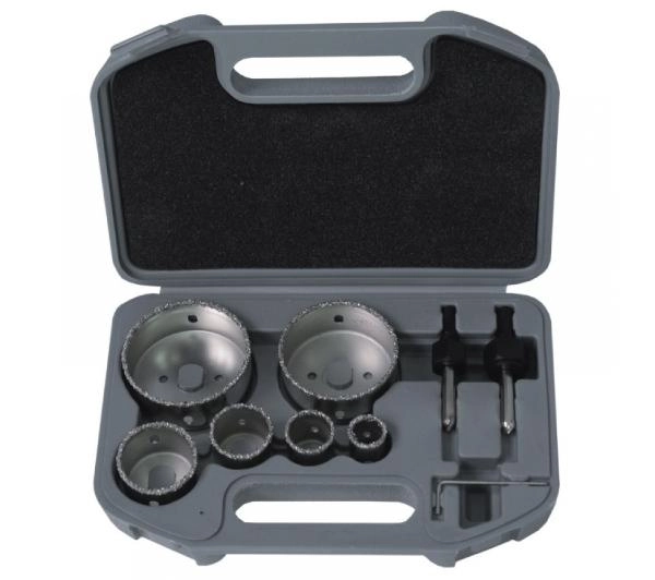 Zestaw wierteł nasyp węglika wolframuW zestawie:<ul> <li>otwornice o średnicy: 22, 28, 35, 44, 68, 73 mm</li> <li>wiertło pilotujące z adapterem do otwornic > 30 mm</li> <li>wiertło pilotujące z adapterem do otwornic < 30 mm</li> <li>klucz imbusowy do wymiany wiertła</li> <li>walizka</li></ul>