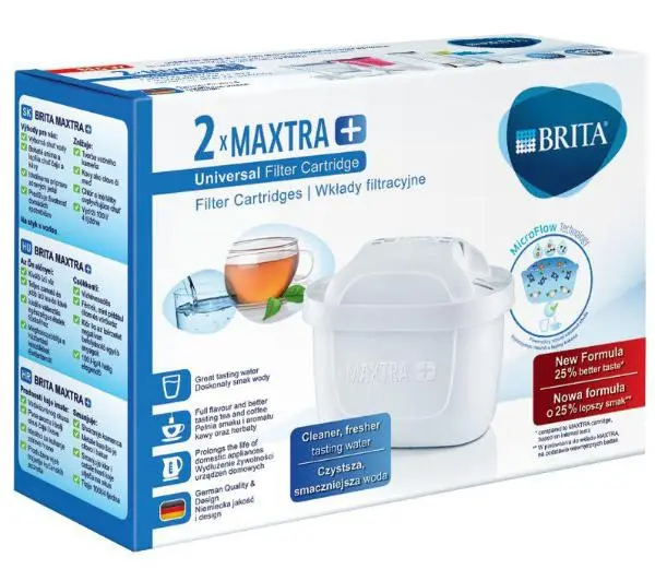 <h4>Brita Maxtra Plus 2 szt</h4><p>Zestaw wkładów zapewniających świeży smak i zapach wody, wyposażonych w innowacyjny filtr z węglem aktywnym i żywicą jonowymienną do usuwania metali ciężkich i chloru.</p><h4>Poznaj Brita Maxtra Plus 2 szt</h4><a></a><h5>SMACZNA WODA</h5><p>Zyskaj wodę wysokiej jakości, która nada prawdziwy, intensywny smak i naturalny aromat potrawom, kawie czy herbacie przygotowanym w domu bądź biurze. Dzięki wkładom Brita Maxtra Plus nie musisz już kupować wody w butelkach.</p><a></a><h5>FILTR MICROFLOW</h5><p>Węgiel aktywny z łupin orzechów kokosowych zamknięty we wkładzie Brita Maxtra Plus efektywnie pochłania chlor i związki chloru, by oczyszczona woda z kranu zachowała świeży, orzeźwiający smak.</p><a></a><h5>WKŁAD JONOWYMIENNY</h5><p>Martwisz się złym stanem instalacji wodociągowych lub korozją rur doprowadzających wodę? Specjalny wymiennik jonowy we wkładach Brita Maxtra Plus całkowicie zatrzymuje toksyczne metale ciężkie, w tym m.in. ołów i miedź – wszystko dla pełnej ochrony zdrowia.</p><a></a><h5>BEZPIECZEŃSTWO URZĄDZEŃ</h5><p>Woda przygotowana przy pomocy Brita Maxtra Plus nadaje się do żelazek, ekspresów do kawy czy czajników. Zapomnij o trudnym do usunięcia kamiennym osadzie i awariach domowego sprzętu dzięki redukcji tymczasowej twardości wody.</p><a></a><h5>CERTYFIKAT TÜV RHEINLAND</h5><p>Wkłady filtrujące Brita Maxtra Plus zostały przebadane pod kątem bezpieczeństwa dla zdrowia, a lepszy wygląd, smak i zapach przefiltrowanej wody do gotowania i picia potwierdza atest niemieckiego instytutu jakości TÜV.</p><a></a><h5>CZYSTE ŚRODOWISKO</h5><p>Ciesz się smaczną, czystą wodą i chroń środowisko naturalne – wkłady filtrujące Brita Maxtra Plus możesz poddać recyclingowi, a rezygnacja z plastikowych butelek dostarczy dodatkowych oszczędności, zmniejszając ilość odpadów.</p><h4>Brita Maxtra Plus 2 szt z bliska</h4><h6>1 WYDAJNE FILTROWANIE</h6><p>Umożliwia skuteczne oczyszczenie aż 100 litrów wody przy użyciu jednego wkładu filtrującego, dzięki czemu zestaw 2 filtrów wystarczy Ci nawet na 2 miesiące!</p><h6>2 FILTR MECHANICZNY</h6><p>Sprawia, że usuwanie zanieczyszczeń i szkodliwych substancji z wody nie wymaga dodatkowego zasilania i przebiega w ciszy.</p><h6>3 PROSTA OBSŁUGA</h6><p>Zamontuj wkład w dzbanku filtrującym i przepłucz go wodą – maksymalną skuteczność filtrowania uzyskasz już po kilku minutach po aktywacji.</p><h4>W opakowaniu Brita Maxtra Plus 2 szt</h4><h6>1Wkłady filtrujące (2 szt.)</h6><h4>Brita – marka godna zaufania</h4><p>Międzynarodowy lider w dziedzinie optymalizacji jakości wody pitnej</p><p>Producent pierwszego, domowego dzbanka filtrującego</p><p>Ponad 50 lat doświadczenia w rozwoju technologii oczyszczania wody</p>