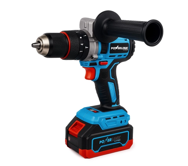 <h2>Moc i swoboda pracy</h2><p>Akumulatorowa wiertarko-wkrętarka Powerlink to wszechstronne narzędzie, które ułatwia wymagające prace remontowe oraz montażowe. Dzięki funkcji udaru oraz dołączonej rączce pomocniczej, sprzęt ten pomaga w obróbce twardych materiałów, zachowując stabilność i bezpieczeństwo. Zestaw z dwoma akumulatorami sprawia, że praca staje się płynna i pozbawiona zbędnych przerw na ładowanie, oferując pełną mobilność w każdych warunkach.</p><h2>Dwa biegi dla kontroli</h2><p>Zastosowanie dwubiegowej regulacji prędkości w zakresie od 0 do 1850 obr./min umożliwia dopasowanie tempa pracy do specyfiki materiału. Pierwszy bieg służy do precyzyjnego osadzania wkrętów, natomiast drugi drastycznie przyspiesza wiercenie w metalu czy drewnie. Intuicyjny przełącznik sprawia, że zmiana trybu następuje błyskawicznie, co bezpośrednio wpływa na efektywność działań. Stabilny chwyt pomaga zachować osiowość nawet przy wysokim momencie obrotowym.</p><h2>Skuteczny udar w murze</h2><p>Częstotliwość udaru na poziomie 21 600 uderzeń na minutę sprawia, że urządzenie bez trudu radzi sobie z cegłą oraz betonem. Wykorzystanie uchwytu 13 mm pozwala na montaż różnorodnych akcesoriów, co znacząco rozszerza zakres zastosowań wkrętarki. To rozwiązanie dedykowane osobom, które poszukują sprzętu radzącego sobie z oporem twardych powierzchni budowlanych. Obecność bocznej rękojeści przyczynia się do zachowania pełnej kontroli nad narzędziem podczas pracy udarowej.</p><h2>Ergonomia i wygoda</h2><p>Przemyślana, kompaktowa konstrukcja urządzenia dba o komfort dłoni, redukując odczuwalne zmęczenie podczas wielogodzinnych zadań. Odpowiednie wyważenie obudowy oraz ergonomiczny kształt rękojeści ułatwiają manewrowanie w trudno dostępnych miejscach. Dodatkowa rączka stabilizująca chroni przed nagłym szarpnięciem, co jest kluczowe dla zachowania bezpieczeństwa. Sprzęt Powerlink oferuje wysoki standard wygody, łącząc funkcjonalność z fizyczną lekkością obsługi narzędzia.</p><h2>Gotowość do pracy ciągłej</h2><p>Obecność dwóch wymiennych akumulatorów w zestawie eliminuje problem przestojów, pozwalając na ładowanie jednego ogniwa w czasie używania drugiego. System zasilania bezprzewodowego zapewnia pełną niezależność od gniazdek elektrycznych, co jest nieocenione na placu budowy lub w ogrodzie. Solidny uchwyt pomocniczy gwarantuje pewne trzymanie wkrętarki podczas pracy nad głową lub w wymuszonych pozycjach. To kompletny ekosystem narzędziowy, który wspiera mobilność każdego majsterkowicza.</p><h2>Najważniejsze zalety</h2><ul> <li>Dwubiegowa przekładnia dostosowująca obroty do wiercenia lub wkręcania.</li> <li>Wydajny mechanizm udarowy wspomagający pracę w betonie i murze.</li> <li>Uchwyt szybkozaciskowy 13 mm umożliwiający stosowanie dużych wierteł.</li> <li>Dwa akumulatory w pakiecie zapewniające ciągłość realizowanych projektów.</li> <li>Rękojeść boczna zwiększająca precyzję i bezpieczeństwo użytkowania.</li></ul>