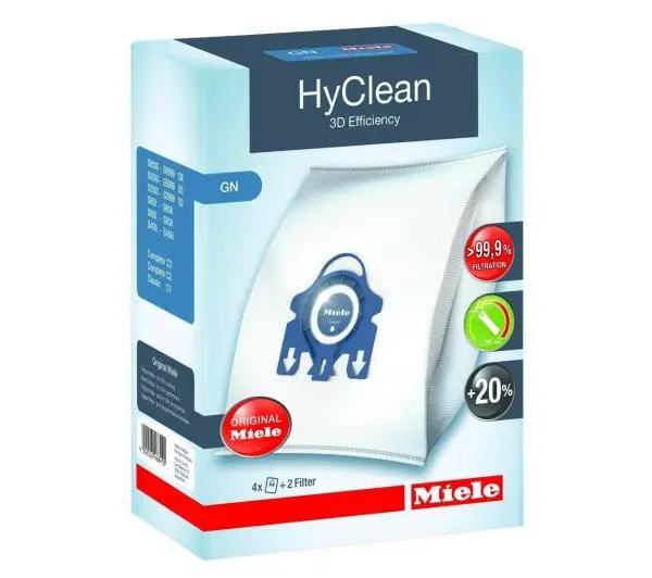 Opakowanie zawiera 4 worki HyClean 3D Efficiency typu GN o pojemności 3,5l, filtr chroniący silnik zapewniający najwyższą jakość odkurzacza oraz filtr wylotowy AirClean, który oczyszcza wydmuchiwane powietrze. Worki HyClean 3D Efficiency zostały opracowane specjalnie dla firmy Miele i wyróżniają się wieloma innowacjami zaletami:<ul> <li>zatrzymują ponad 99,9% wszystkich drobinek kurzu</li> <li>najwyższą efektywnością odkurzania nawet przy niższych poziomach mocy</li> <li>dłuższym użytkowaniem dzięki zastosowaniu technologii 3D</li> <li>higieniczną wymianą worka – automatyczne zamykanie podczas wyjmowania</li></ul>Przeznaczone do zastosowania w odkurzaczach Miele z serii: S 400i – 456i, S 600 - 658, S 800 – 858, S 2000, S 5000, S 8000, Complete C3, Complete C2, Classic C1 Zawartość: 4 Worki GN kolor: niebieski, 1 sztuka filtra wylotowego AirClean oraz 1 sztuka filtra ochronnego na silnik