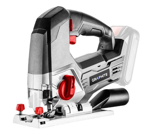 <h3>Wyrzynarka akumulatorowa GRAPHITE Energy+ 58G011 (bez akumulatora)</h3>Szybka i precyzyjna akumulatorowa wyrzynarka GRAPHITE to pewność komfortowej, bezpiecznej i dobrze wykonanej pracy. Posiada szereg atutów i udogodnień takich jak: układ regulacji obrotów, aluminiowa stopa z regulacją kąta 0-45 stopni, 3-stopniowa regulacja ruchu wahadłowego, beznarzędziowa wymiana brzeszczotów, dioda LED. Wyrzynarka GRAPHITE to urządzenie o wysokim stopniu bezpieczeństwa dzięki poliwęglanowej osłonie brzeszczotu, włącznikowi bezpieczeństwa oraz antypoślizgowemu pokryciu rękojeści. Układ zdmuchiwania i odprowadzania pyłu z powierzchni obrabianego materiału znacznie ułatwia kontrolę. Dodatkowo wyrzynarka posiada prowadnicę równoległą.• Pracuje z akumulatorami 18V Li-Ion, 2Ah lub 4Ah Energy+• Ilość suwów 0-2400 min-1• Szybkie cięcie drewna do 80 mm oraz metalu do 10 mm• Regulacja kąta nachylenia 0-45 stopni w prawo i lewo• 3 stopniowa regulacja ruchu wahadłowego• Dioda LED• Skok brzeszczotu 25 mm• Osłona brzeszczotu• Włącznik z blokadą uruchomienia• Układ zdmuchiwania i odprowadzania pyłuWyposażenie• Prowadnica równoległa