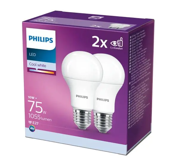 <h2>Światło komfortowedla Twoich oczu</h2> <h2>Philips LEDŻarówka E2710 W (75 W), chłodna biel, 2 szt.</h2><ul> <li>Przyjemna barwa światła</li> <li>Oddawanie rzeczywistych kolorów</li> <li>Oszczędność i trwałość</li> <li>Żarówka spełniająca normy bezpieczeństwa fotobiologicznego</li> <li>Przyjazne środowisku</li> <li>Długie działanie</li></ul> <h2>Dlaczego warto dbać o komfort oczu?</h2><p>Jakość naszego życia zależy od tego, jak widzimy świat dookoła nas. Oświetlenie wpływa na nasze zdrowie, samopoczucie i efektywność w pracy. Jego słaba jakość może prowadzić do zmęczenia oczu, powodować ból głowy, nudności czy problemy z koncentracją. Dzięki Philips LED możesz mieć pewność, że oświetlenie jest komfortowe dla oczu i bezpieczne dla Twojego zdrowia.</p><p>* Zaprojektowane dla komfortu Twoich oczu.</p><p>Odwiedź www.philips.com/eyecomfort, aby dowiedzieć się więcej o migotaniu, efekcie stroboskopowym i pozostałych parametrach.</p> <h2>Światło najwyższej jakości</h2><p>Produkty Philips LED są testowane laboratoryjnie i spełnają normę bezpieczeństwa fotobiologicznego. Dzięki temu masz pewność, że światło jest bezpieczne i przyjazne dla Twoich oczu.</p> <h2>Przyjemna barwa światła</h2><p>Niższa temperatura barwowa oznacza światło ciepłe, sprzyjające relaksowi i wyciszeniu (2200-2700K). Naturalne, jasne światło białe wiernie odwzoruje światło dzienne (3000K). Wyższa temperatura barwowa to światło orzeźwiające i pobudzające do działania (4000-5000K).</p> <h2>Energooszczędne i przyjazne środowisku</h2><p>Oświetlenie LED zużywa nawet o 90% mniej energii niż standardowe żarówki. Jedna żarówka Philips LED może świecić nawet ponad 15 lat. Zakup zwróci się w krótkim czasie, pozwoli oszczędzać pieniądze i zadbać o środowisko naturalne.</p> <h2>Rzeczywiste oddawanie barw</h2><p>Popraw wygląd wnętrza i nadaj mu prawdziwych kolorów. Żarówki Philips LED mają wysoki wskaźnik oddawania barw, co oznacza, że oświetlając obiekty, wiernie oddają ich rzeczywiste i naturalne kolory.</p> <h2>Najważniejsze parametry</h2><ul> <li>Gwint: E27</li> <li>Moc: 10 W (odpowiednik żarówki 75 W)</li> <li>Kształt: A60</li> <li>Wykończenie: matowe</li> <li>Temperatura barwowa: 4000 K</li> <li>Zasilanie: 220-240 V</li> <li>Trwałość: do 15 000 godz.</li> <li>CRI: 80</li> <li>Strumień świetlny: 1055 lm</li> <li>Wysokość: 11 cm</li> <li>Szerokość: 6 cm</li> <li>Ilość żarówek w opakowaniu: 2 szt.</li></ul>